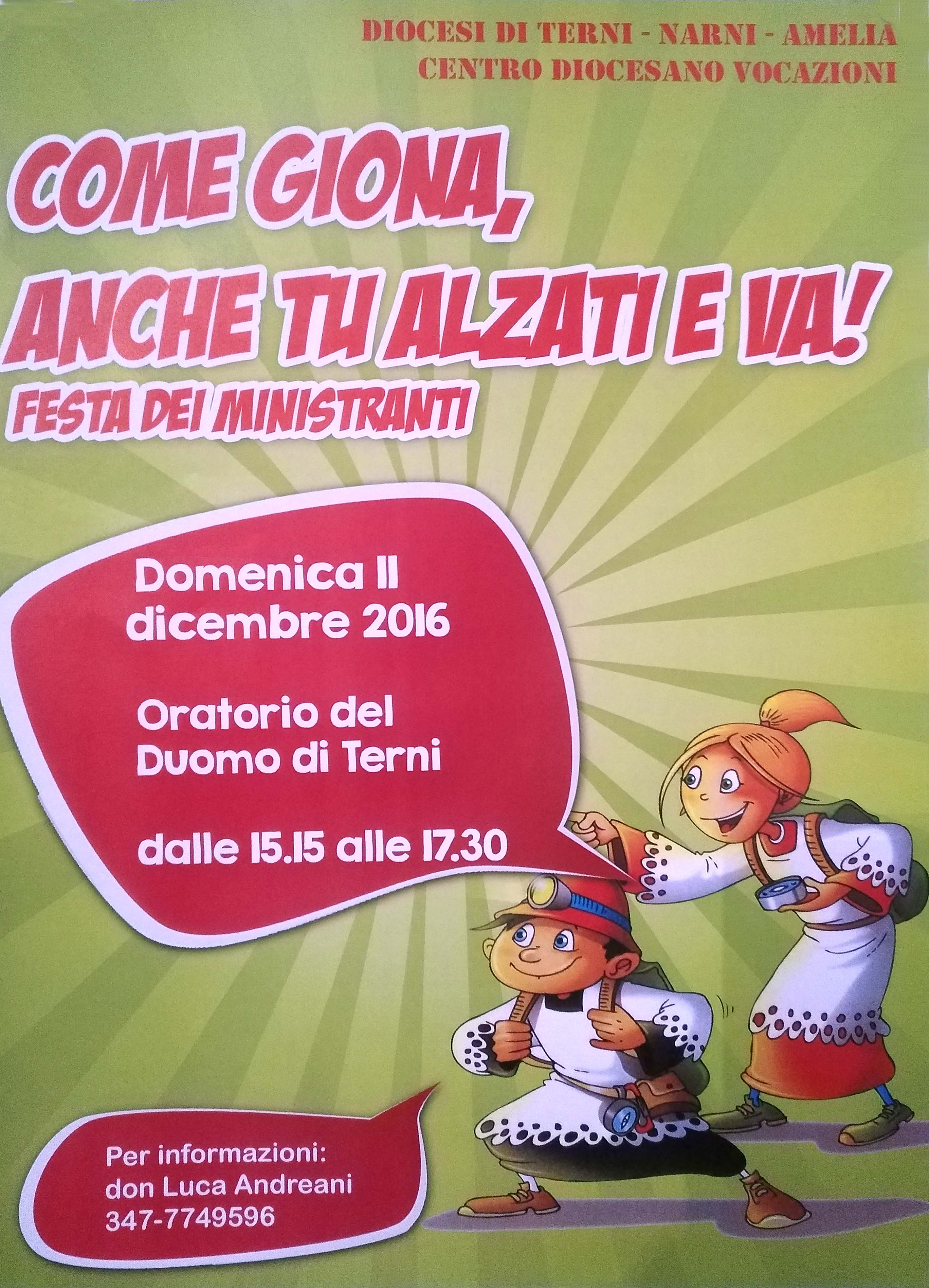 Domenica 11 dicembre nell’oratorio della Cattedrale di Terni dalle ore 15.15 alle 17.30 si terrà la festa dei ministranti delle diverse parrocchie dedicato a: “Come Giona anche tu alzati e va”, promossa dal centro diocesano Vocazioni. Un pomeriggio in amicizia per conoscersi e pregare insieme, e con giochi, momenti di fraternità, e la consegna di un ricordo. Protagonisti della giornata i ragazzi e ragazze impegnati nelle parrocchie nel servizio all’altare, un servizio liturgico che rappresenta l’opportunità per entrare a contatto, più da vicino, con la vita dei sacerdoti, ma soprattutto il ministrante vive sull’altare e vicino all’altare e ha una possibilità straordinaria di stare “accanto a Gesù”, che sull’altare si fa vicino attraverso il dono dell’Eucarestia.