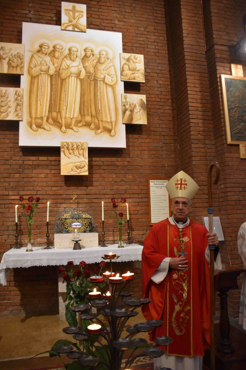 Carissimi fratelli e sorelle i nostri cari primi martiri francescani venerati in questa parrocchia e in questo santuario siano per noi esempio nella sequela di Gesù via verità e vita; in questo tempo così travagliato siano esempio perché possiamo tutti vivere una fede profonda e incarnata nel quotidiano delle nostre attività. Una fede capace di inoltrare il proprio respiro fino agli estremi orizzonti dell’amore e renderlo fecondo nel bene e nella pace; pace e bene che poi sono il saluto tipico della famiglia francescana.