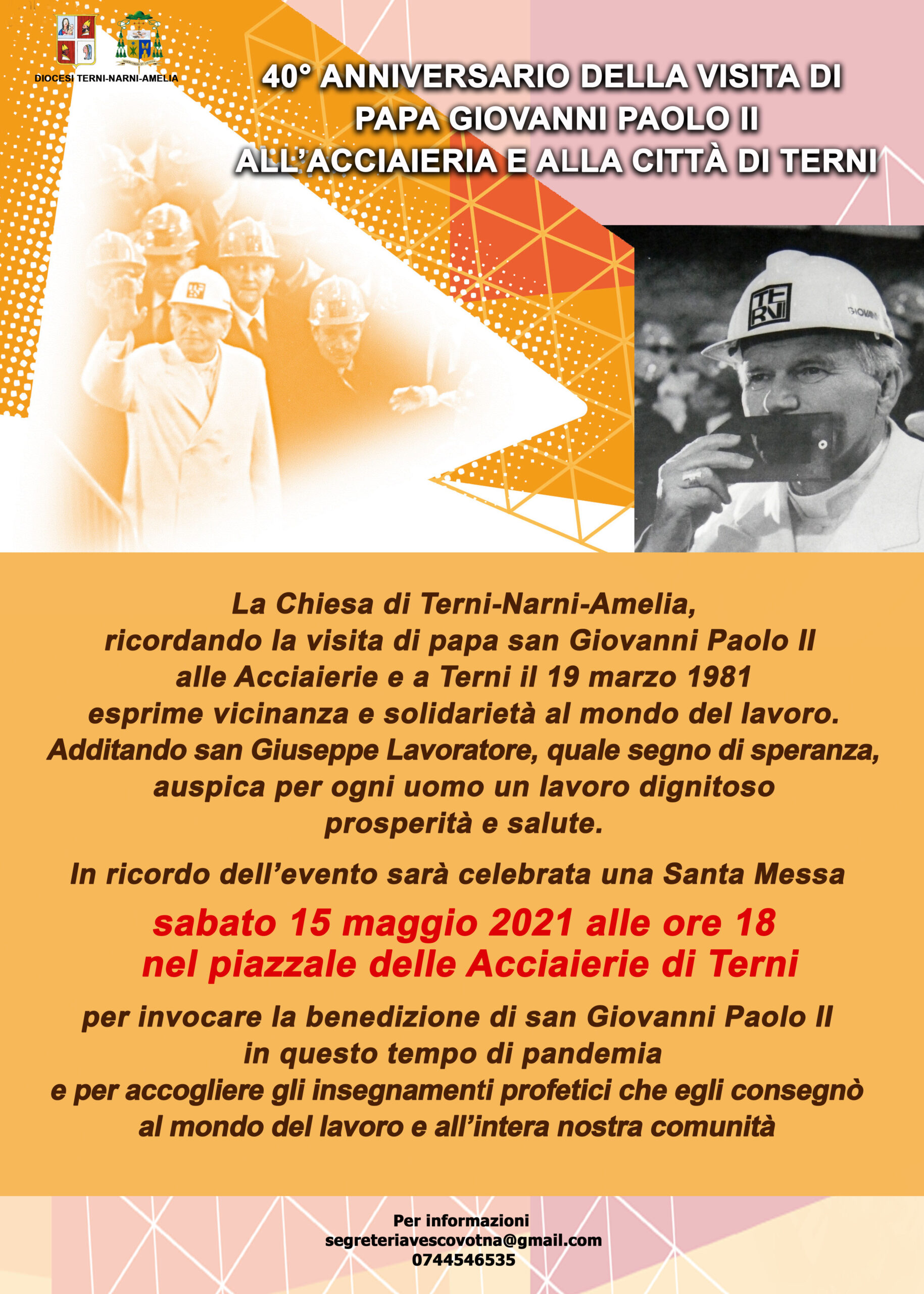 Terni, città operaia, celebra il 40° anniversario della visita di papa san Giovanni Paolo II alle acciaierie e alla città di Terni (19 marzo 1981) con la messa che sarà celebrata dal vescovo Piemontese il 15 maggio 2021 alle ore 18 presso Acciai Speciali Terni, in viale Brin, nello stesso piazzale interno all’acciaieria dove il Papa incontro migliaia di lavoratori.