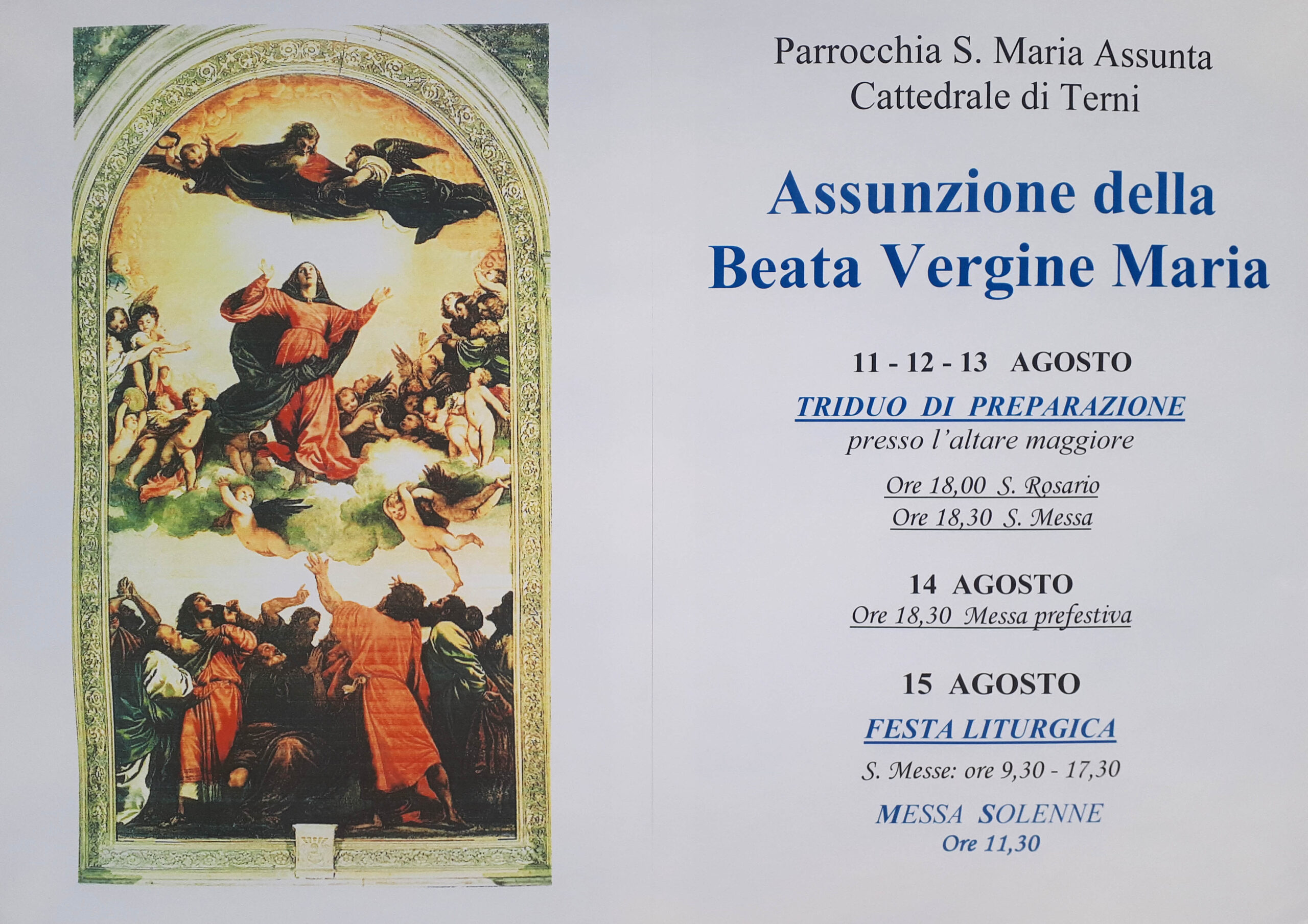 Nella cattedrale di Santa Maria Assunta di Terni l’11-12-13 agosto si terrà il triduo di preparazione alla festa con la recita del rosario alle ore 18.00 e la Messa alle 18.30 presso l’altare maggiore.