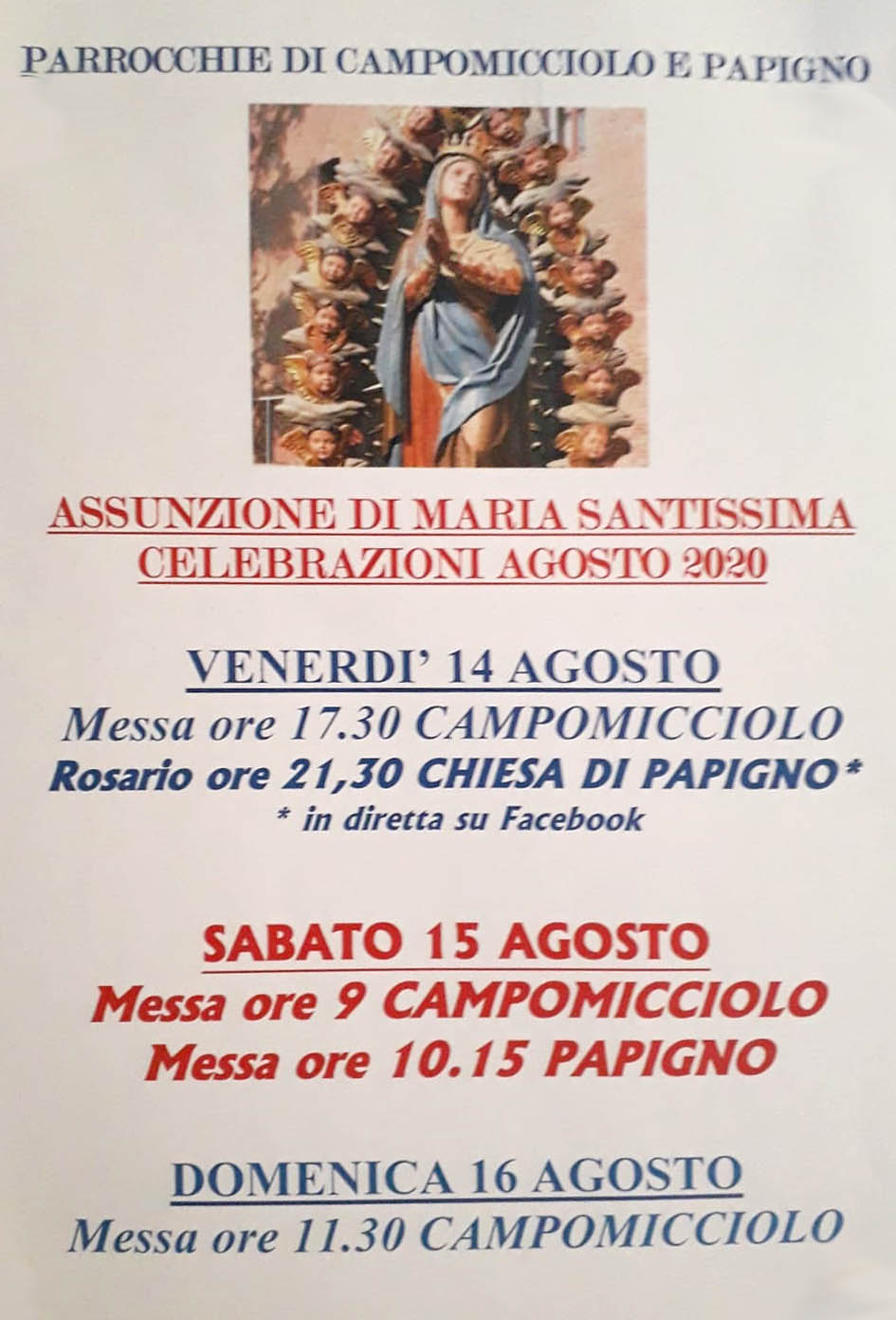 Nelle parrocchie di Campomicciolo e Papigno sarà celebrata la messa il 14 agosto alle ore 17.30 a Campomicciolo e alle ore 21.30 la recita del Rosario nella chiesa di Papigno.