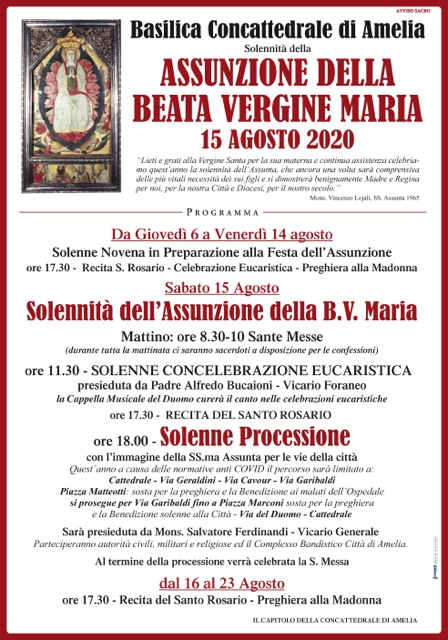Nella concattedrale di Amelia fino al 14 agosto è in programma la solenne novena di preparazione alla festa alle ore 17.30 con la recita del Rosario, la Messa e la preghiera mariana.