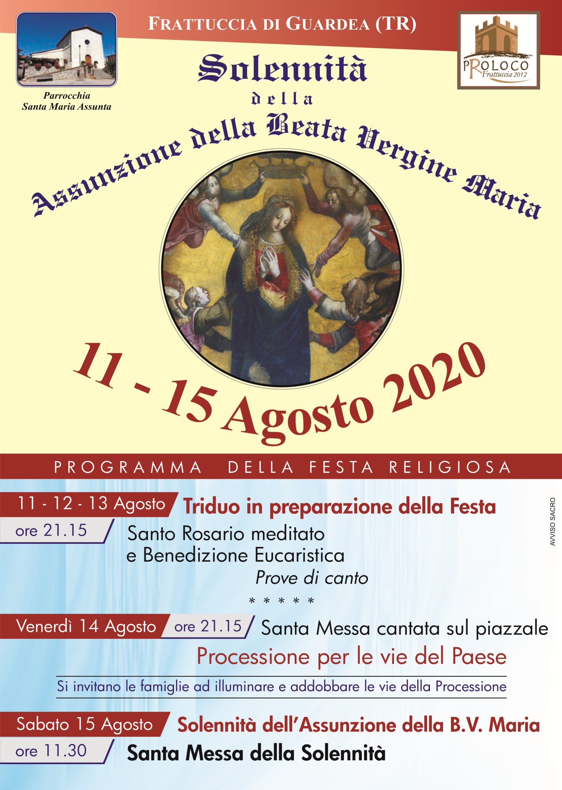 A Frattuccia dall’11 al 13 agosto Triduo in preparazione alla festa. Venerdì 14 agosto alle 21.15 santa messa sul piazzale del paese e processione per le vie del paese. Sabato 15 agosto alle ore 11.30 Santa Messa solenne