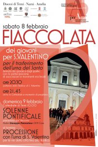 Le celebrazioni cominceranno sabato 8 febbraio alle ore 20.30 con la fiaccolata-pellegrinaggio dei giovani, dei gruppi sportivi, dei gruppi parrocchiali della diocesi, insieme ai rappresentanti dei movimenti e associazioni giovanili e all’intera comunità diocesana, per accompagnare il trasferimento dell’urna del Santo Patrono dalla basilica di San Valentino in Cattedrale. La processione partirà dal sagrato della basilica di San Valentino e proseguirà lungo via papa Zaccaria, via San Valentino, via Menotti Serrati, via Turati, corso del Popolo, via dell’Annunziata, via del Vescovado, piazza Duomo. In cattedrale la conclusione della processione con la breve preghiera del vescovo padre Giuseppe Piemontese..