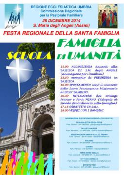 Si terrà ad Assisi la prima festa regionale dedicata al tema “Famiglia scuola di umanità”, promossa dalla Commissione per la Famiglia e la Vita della Ceu, in programma a Santa Maria degli Angeli, domenica 28 dicembre, giorno in cui la Chiesa celebra la solennità della Sacra Famiglia di Nazareth. Si tratta di una significativa iniziativa «sollecitata dalla eccezionalità del tempo che stiamo vivendo, dopo il Sinodo Straordinario dei Vescovi sulla Famiglia (Vaticano, 5-19 ottobre) ed in attesa di quello Ordinario del 2015.