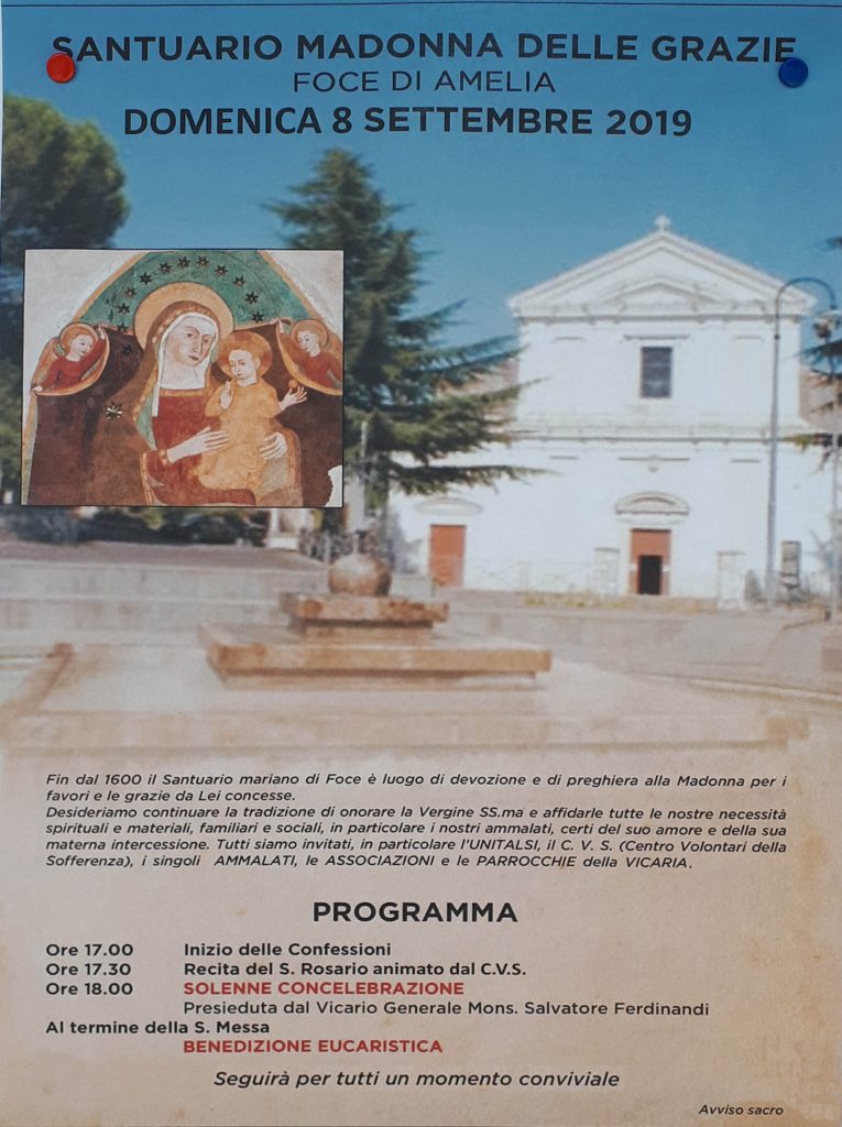 In occasione della festa della natività di Maria l’8 settembre, presso il santuario della Madonna delle Grazie a Foce di Amelia, dove è custodita una miracolosa immagine quattrocentesca della Madonna, si rinnova la tradizione del pellegrinaggio dei malati, accompagnati dai volontari dell’Unitalsi e del Centro volontari della sofferenza (Cvs).