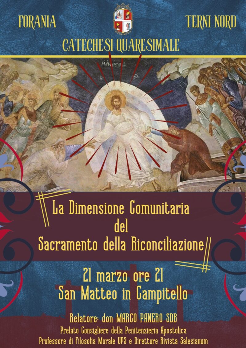 Si terrà giovedì 21 marzo alle ore 21 nella chiesa di San Matteo in Campitello la cetechesi “La dimensione comunitaria del Sacramento della Riconciliazione” promosso nel periodo quaresimale dalla Forania Terni Nord. Guiderà la riflessione don Marco Panero SdB prelato consigliere della Penitenzieria Apostolica e professore di Filosofia morale presso l’Università Salesiana.