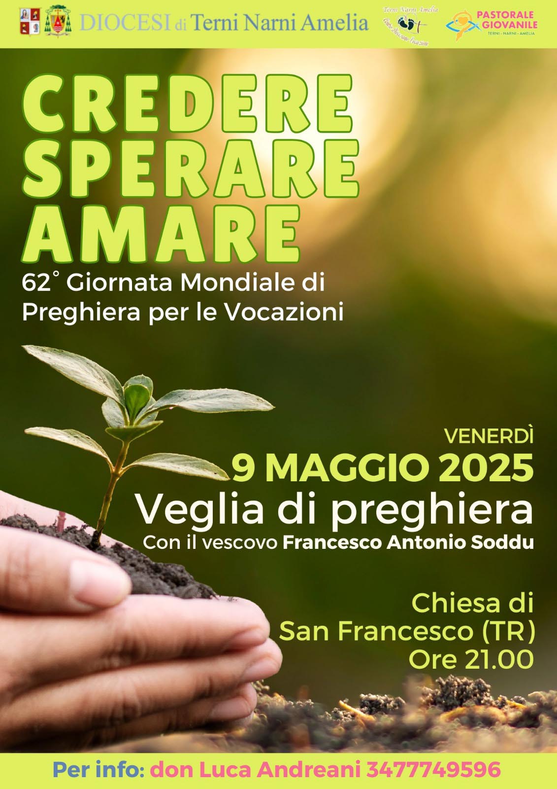 La 62ma Giornata Mondiale di Preghiera per le Vocazioni ha per tema: “Credere sperare amare” scelto dall’Ufficio Nazionale per la pastorale delle vocazioni riprende il messaggio di papa Francesco che riporta l’attenzione alla radice di ogni vocazione come cammino di amore: “desidero rivolgere un invito gioioso e incoraggiante ad essere pellegrini di speranza donando la vita con generosità. La vocazione è un dono prezioso che Dio semina nei cuori, una chiamata a uscire da sé stessi per intraprendere un cammino di amore e di servizio. Ed ogni vocazione nella Chiesa – sia essa laicale o al ministero ordinato o alla vita consacrata – è segno della speranza che Dio nutre per il mondo e per ciascuno dei suoi figli”.