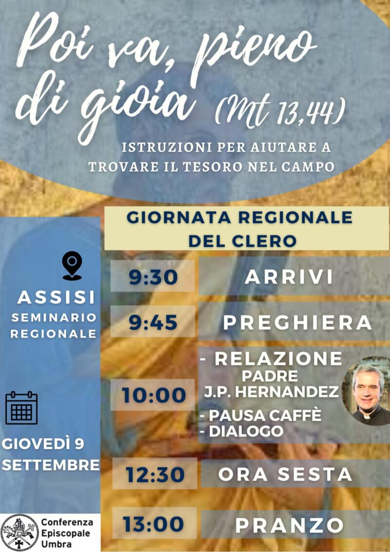 La Giornata Sacerdotale regionale si svolgerà il prossimo 9 settembre presso il Seminario regionale di Assisi, dalle ore 9.30 alle 13, con la relazione di Padre Jean-Paul Hernandez, gesuita, noto per le sue trasmissioni su TV2000, per una riflessione sulla chiamata al ministero ordinato.