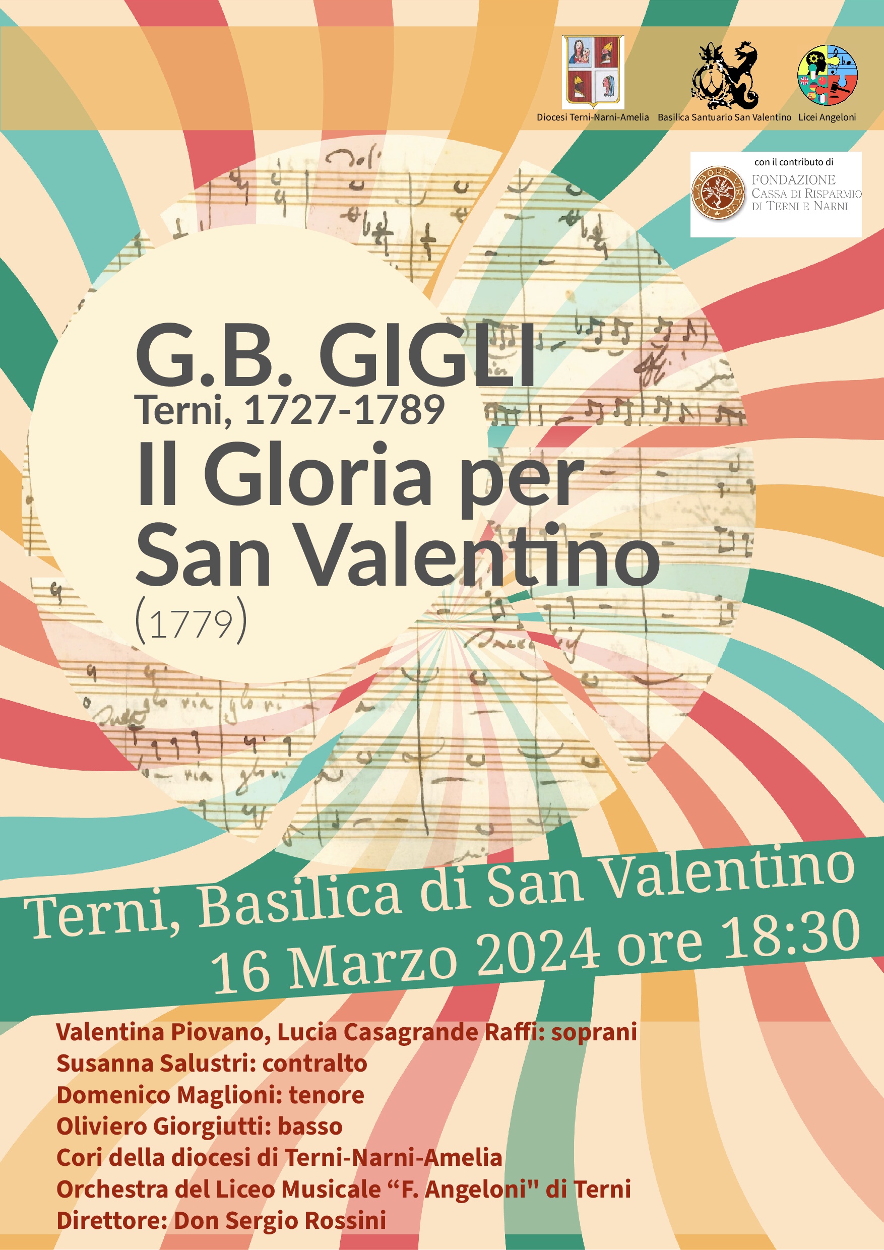 Sabato 16 marzo alle ore 18.30 nella basilica di San Valentino si terrà il concerto “Il Gloria per San Valentino”, opera per soli, coro e orchestra di Giovanni Battista Gigli composta nel 1779. L’evento, promosso nell’ambito delle manifestazioni valentiniane 2024 “Camminiamo insieme” dalla Diocesi di Terni-Narni-Amelia, dalla Basilica San Valentino, dai Licei Angeloni di Terni, con il contributo della Fondazione Carit, vedrà protagonisti 17 giovani musicisti dell’orchestra del Liceo Musicale “F. Angeloni” di Terni, 75 coristi del Coro della diocesi di Terni-Narni-Amelia composto dai coristi di otto corali: il coro della Pace, coro Don Bruno Medori, Harmoniae colestes, Musica Antiqua, coro di San Cristoforo, coro polifonico San Francesco, coro Sandro Castiglione, ed i 5 solisti: Valentina Piovano, Lucia Casagrande Raffi soprani; Susanna Salustri contralto; Domenico Maglioni tenore; Oliviero Giorgiutti basso, diretti dal maestro don Sergio Rossini.