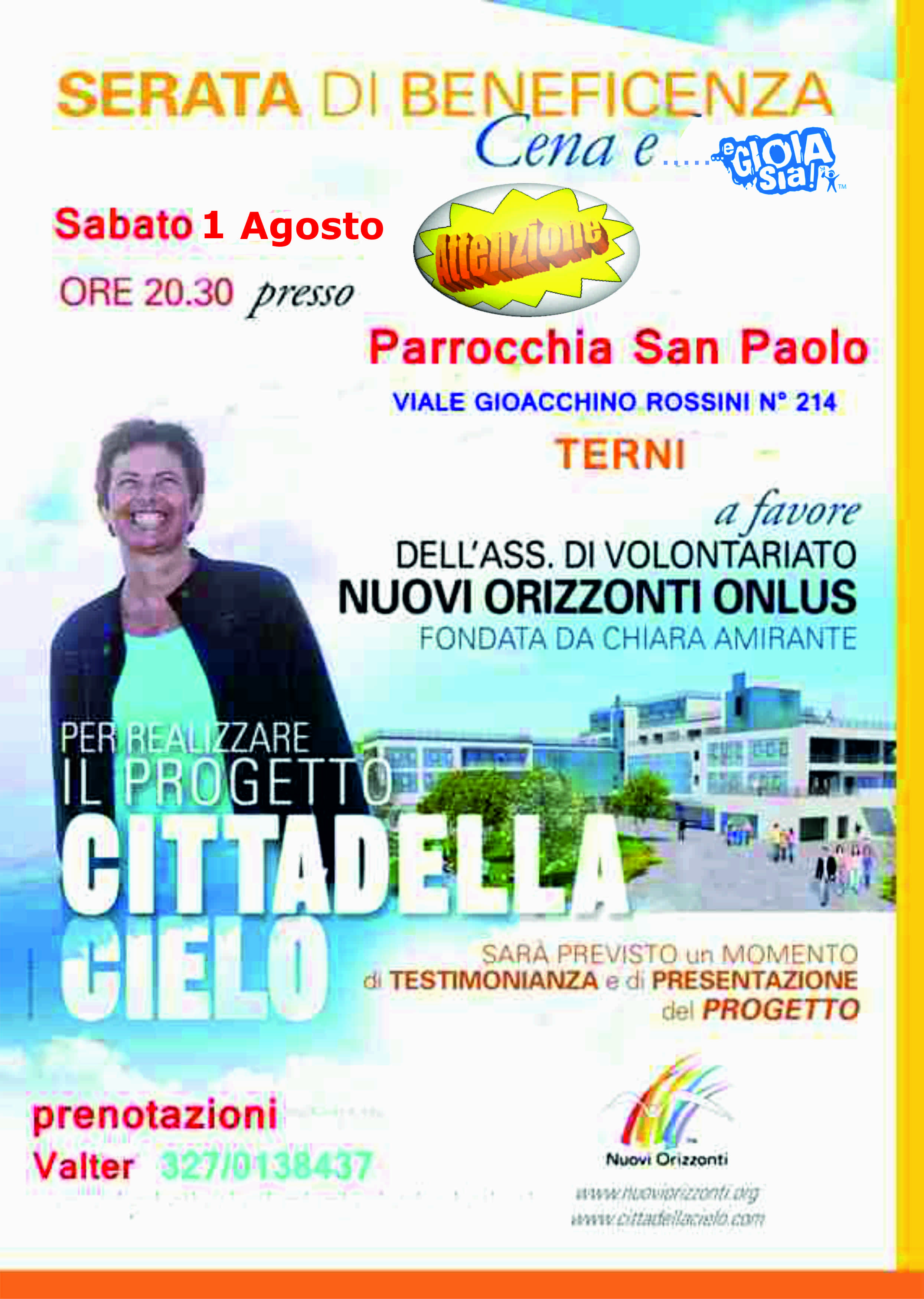 All’interno di questi Centri di accoglienza, di sostegno, di ascolto, di prevenzione, di formazione al volontariato internazionale, case famiglia, centri per ragazze madri, bambini di strada, malati terminali. Per contribuire a tutto questo il 1 agosto alle ore 20.30 a San Paolo si terrà una cena di beneficenza per Cittadella Cielo, con una testimonianza dell’attività svolta.