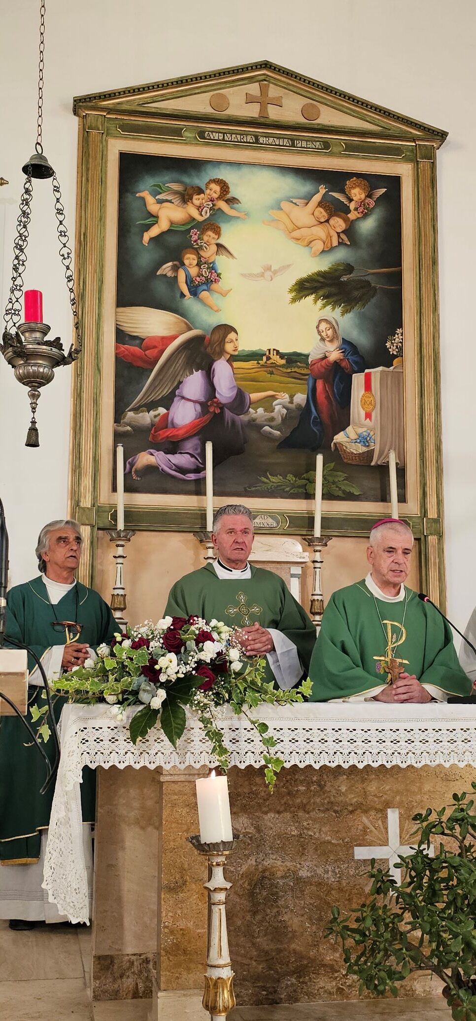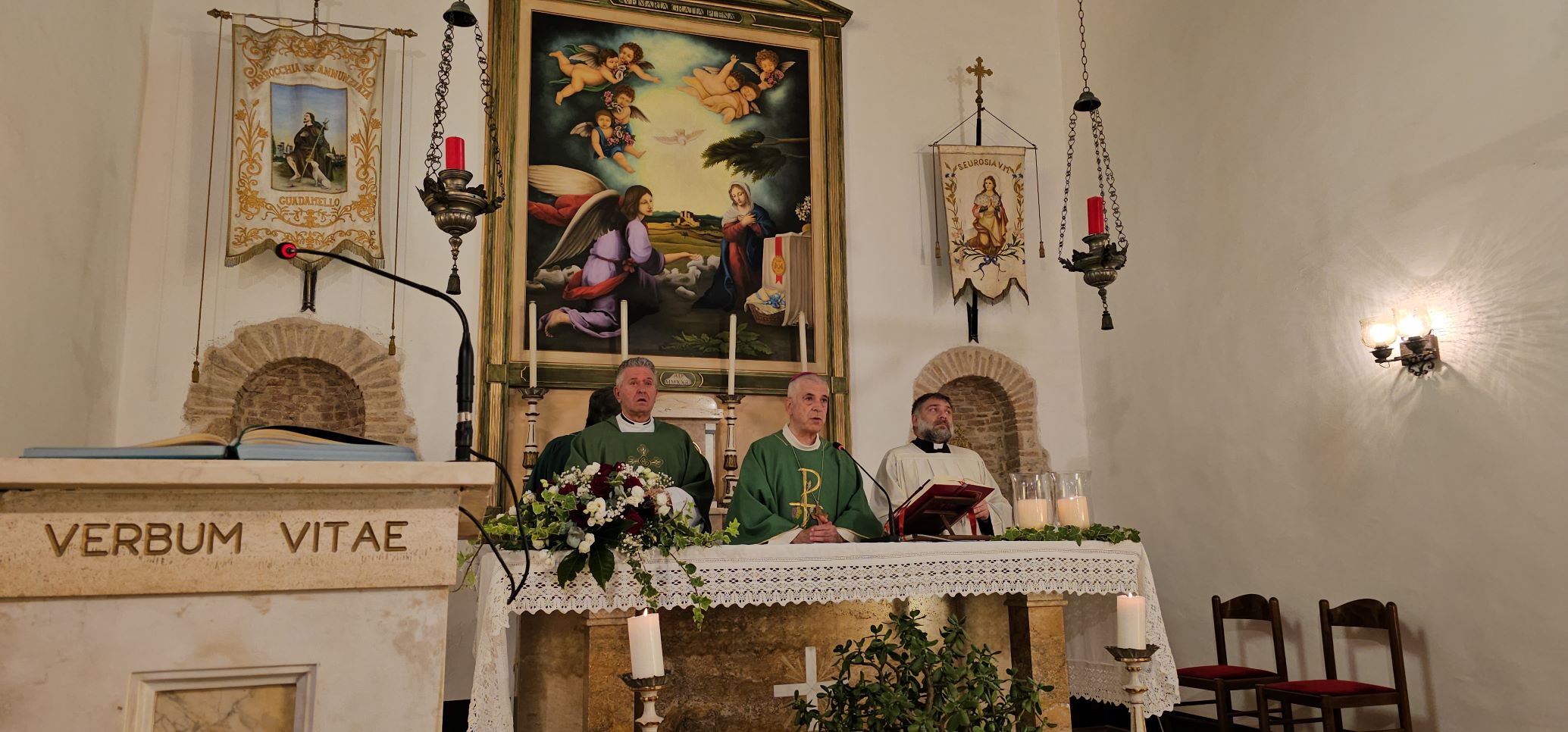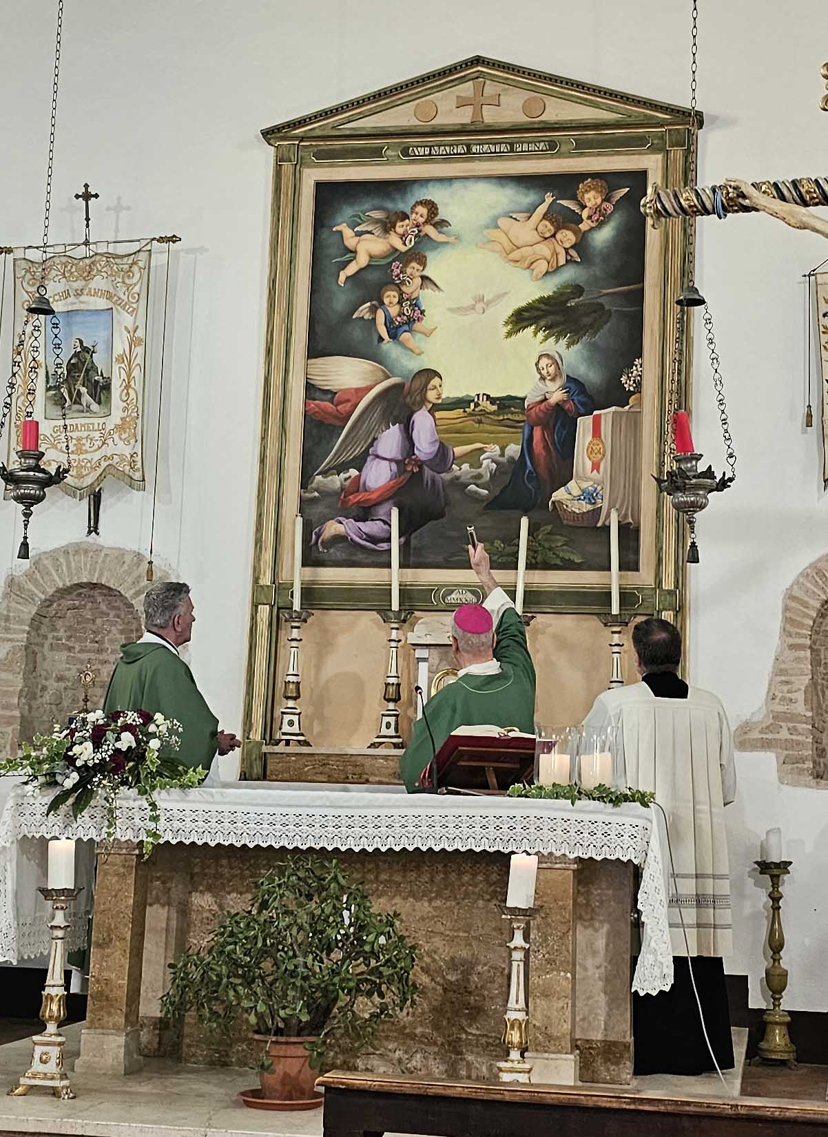Con la celebrazione di sabato 6 luglio, presieduta dal vescovo Francesco Soddu e concelebrata dal parroco don Pietro Krajewski, a Guadamello di Narni sono stati inaugurati i lavori di rifacimento del tetto della chiesa di Santa Maria Annunziata e benedetta la pala d’altare, raffigurante l’Annunciazione, opera della giovane artista Maria Virginia Cucco Gasperoni, realizzata con le donazioni della popolazione. Gli altri lavori sono stati realizzati grazie al contributo della Fondazione Carit e dell’ 8×1000 per la Chiesa Cattolica.