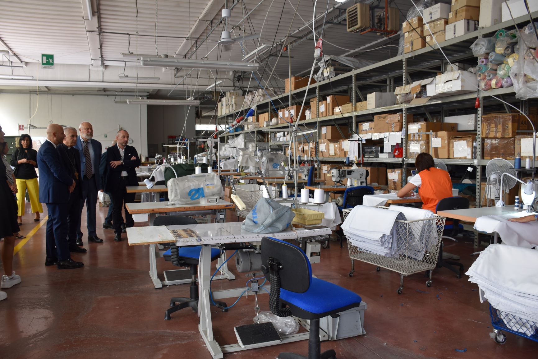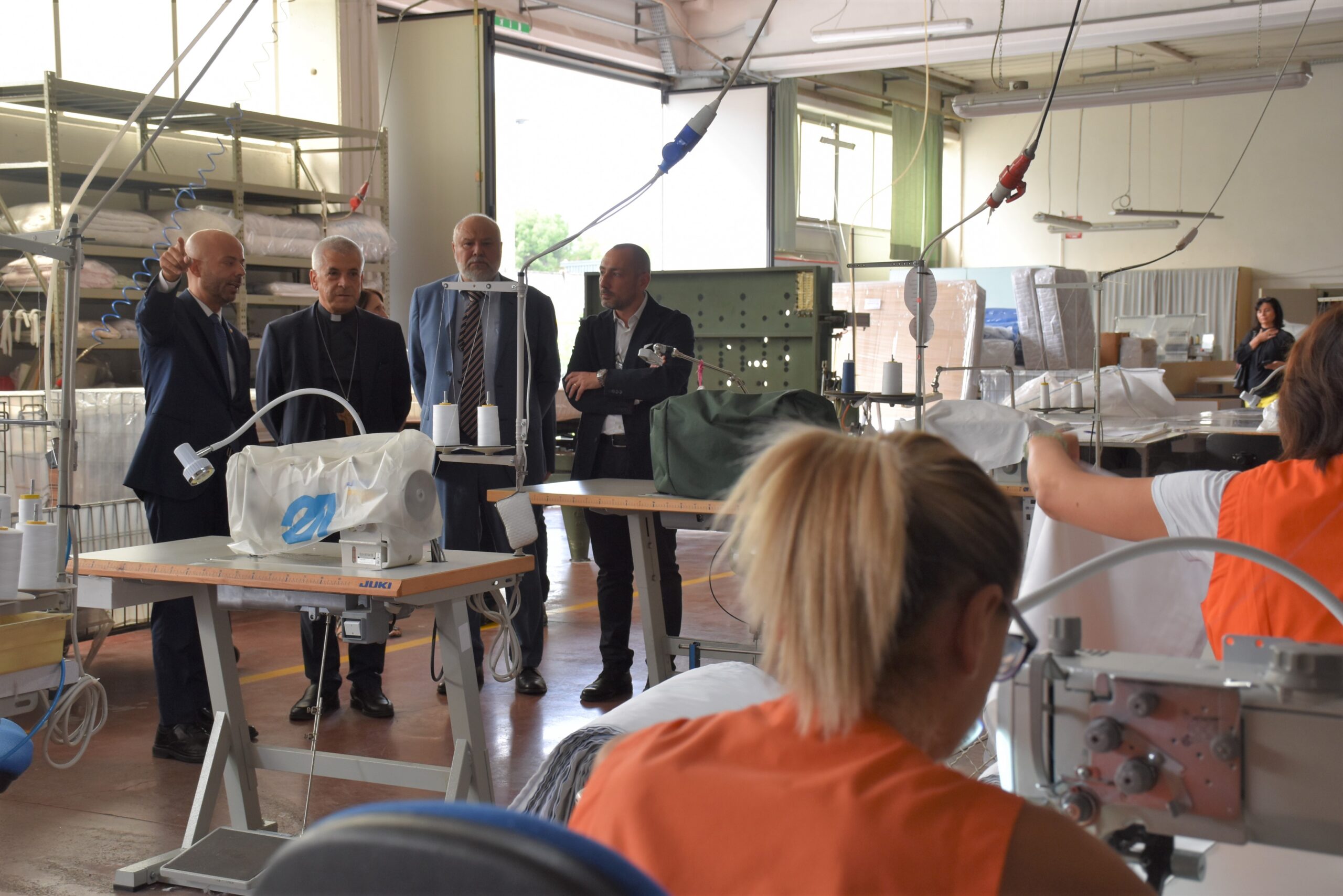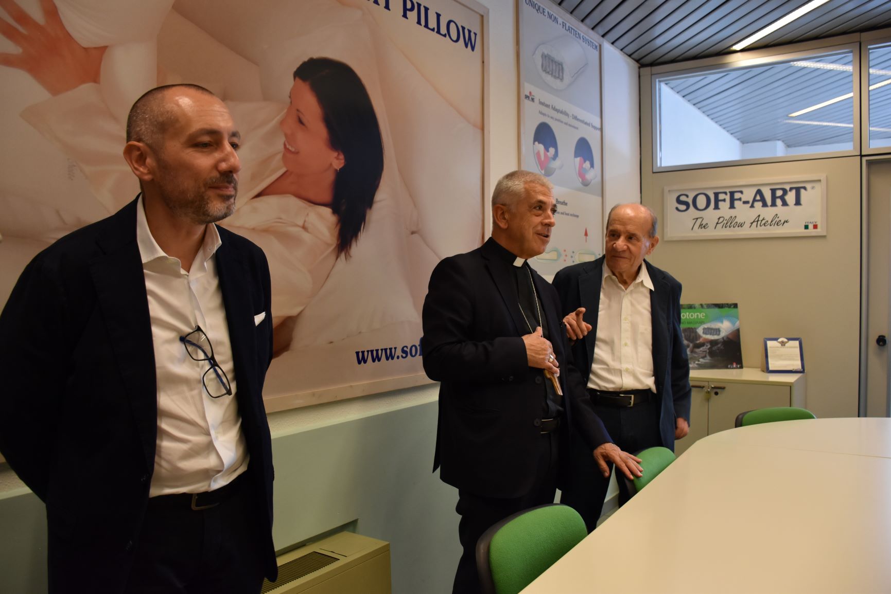 Il vescovo Soddu in visita all’azienda di cuscini Soff Art