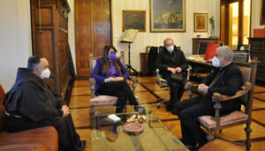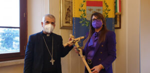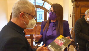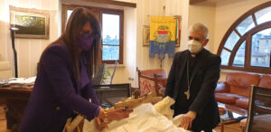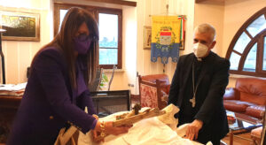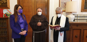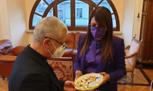Il vescovo ha donato alla presidente Pernazza un grande crocifisso il legno intarsiato. La presidente ha donato dei libri sui cammini farncescani nel territorio provinciale e sulle tradizioni alimentari e festività rituali, insieme ad un piatto in ceramica di Deruta.