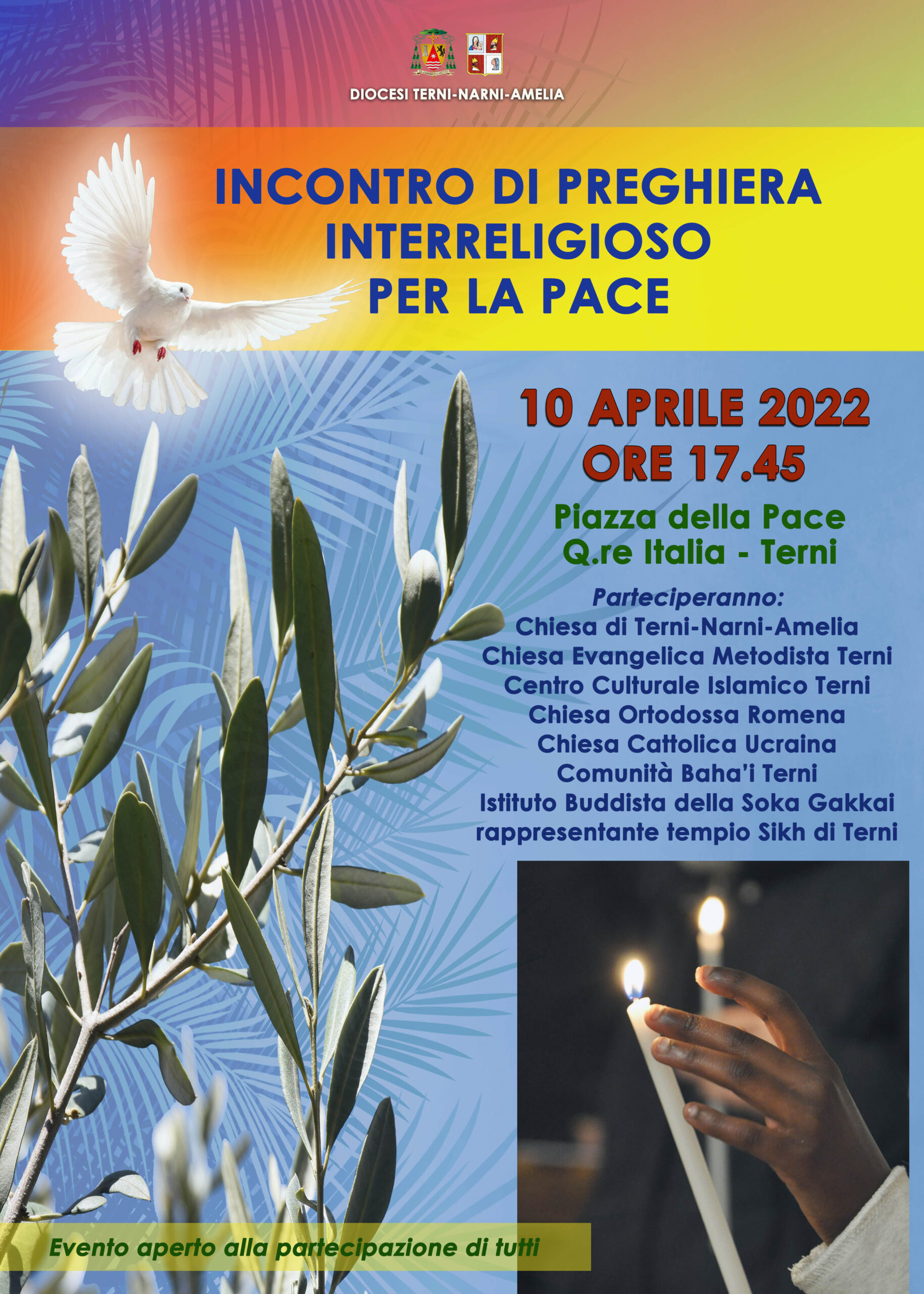 Prenderanno parte all’incontro, le autorità cittadine, i rappresentanti della chiesa cattolica di Terni-Narni-Amelia, la chiesa evangelica metodista di Terni, Centro Culturale Islamico Terni, Chiesa Ortodossa Rumena, Chiesa Cattolica Ucraina, comunità Baha’i di Terni, istituto Buddista della Soka Gakkai, rappresentante tempio Sikh di Terni.