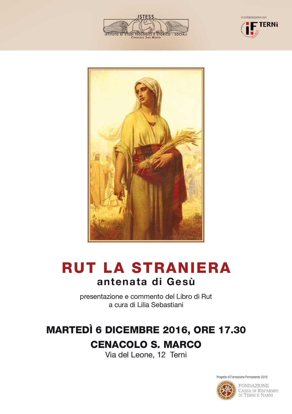 Martedì 6 dicembre alle ore 17.30 al cenacolo San Marco di Terni si terrà l’incontro con la teologa Lilia Sebastiani che illustrerà la esegesi biblica del Libro di Rut.