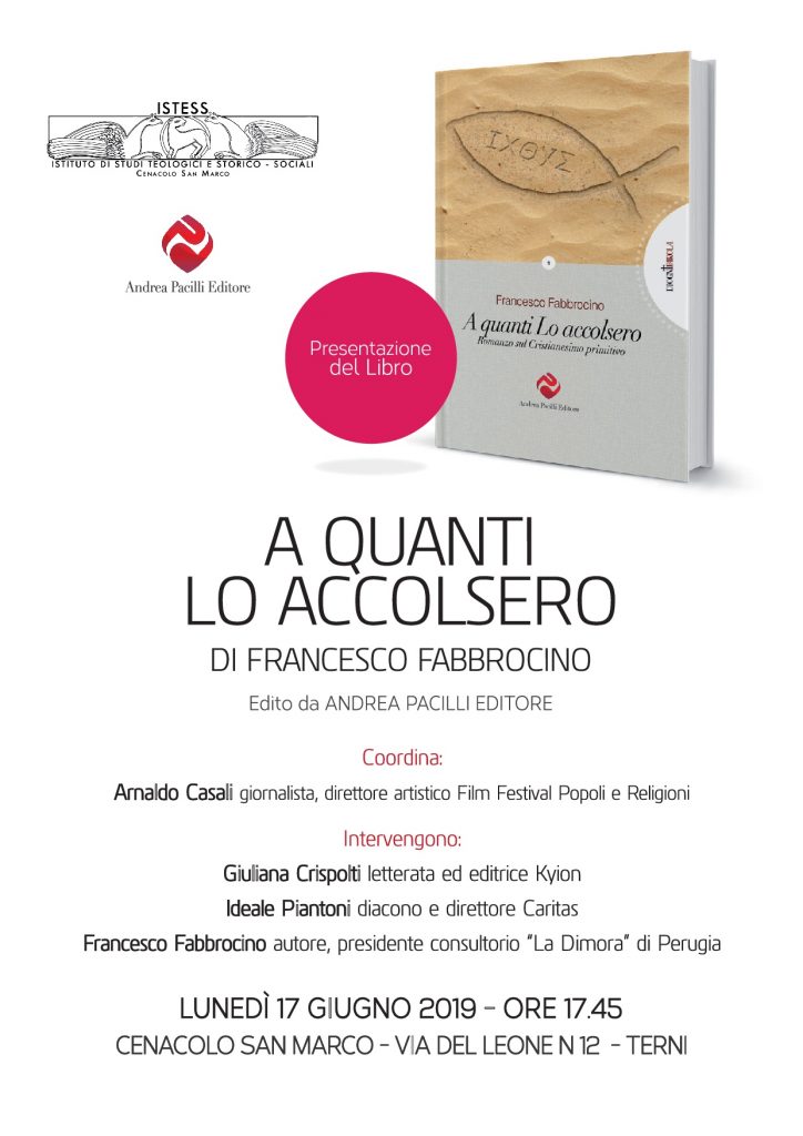 Lunedì 17 giugno alle ore 17.45 al cenacolo San Marco di Terni si terrà la presentazione del romanzo storico sul Cristianesimo primitivo “A quanti lo accolsero” del sociologo Francesco Fabbrocino, presidente del Consultorio familiare “La Dimora” di Perugia, editore Andrea Pacilli.