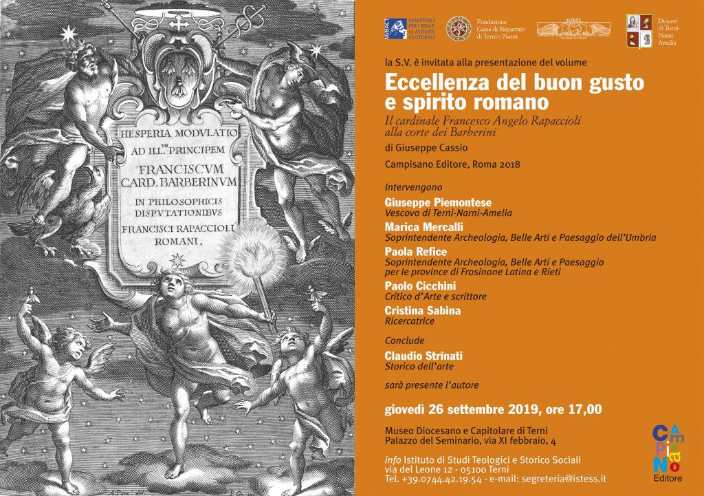 Giovedì 26 settembre alle ore 17 al Museo diocesano di Terni si terrà la presentazione del libro “Eccellenza del buon gusto e spirito romano. Il cardinale Francesco Angelo Rapaccioli alla corte dei Barberini” Campisano editore, autore Giuseppe Cassio.