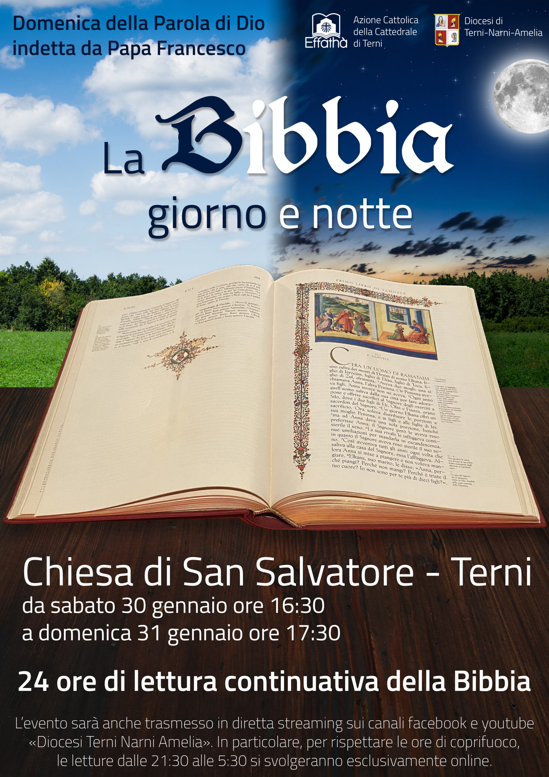 Da sabato 30 gennaio a domenica 31 gennaio nella chiesa del Santissimo Salvatore a Terni, si svolgerà la seconda edizione di: “La Bibbia giorno e notte” la lettura della seconda parte della Bibbia, i Libri Storici (Giosuè, Giudici, Rut, 1-2 Samuele, 1-2 Re, Tobia). Una notte e un giorno, senza interruzioni e commenti nei quali saranno letti integralmente i vari libri dall’inizio alla fine, così come la tradizione e la chiesa li hanno consegnati attraverso i millenni.