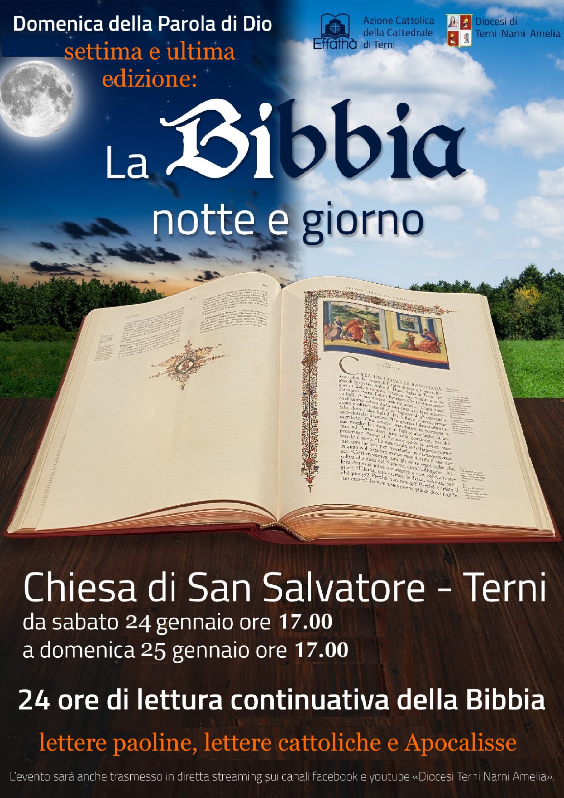 Per la Domenica della Parola di Dio, il Settore dell’Apostolato Biblico dell’Ufficio Catechistico Diocesano insieme all’Azione Cattolica Diocesana organizzano 24 ore di lettura continuativa della Bibbia, settima edizione concludendo la lettura del Nuovo Testamento, dalle ore 17 di sabato 24 gennaio alle ore 17 di domenica 25 gennaio presso la Chiesa di San Salvatore in Terni.