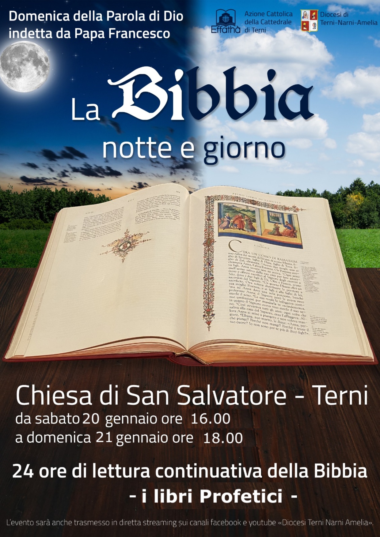 In questo anno che inizia con scenari di guerra e violenza sempre più inquietanti assume un significato tutto speciale la quinta edizione de “La Bibbia Notte e Giorno”, da sabato 20 gennaio ore 16 a domenica 22 gennaio ore 18 nella chiesa del Santissimo Salvatore a Terni, lettura dei Libri Profetici, così da concludere la lettura dell’Antico Testamento.