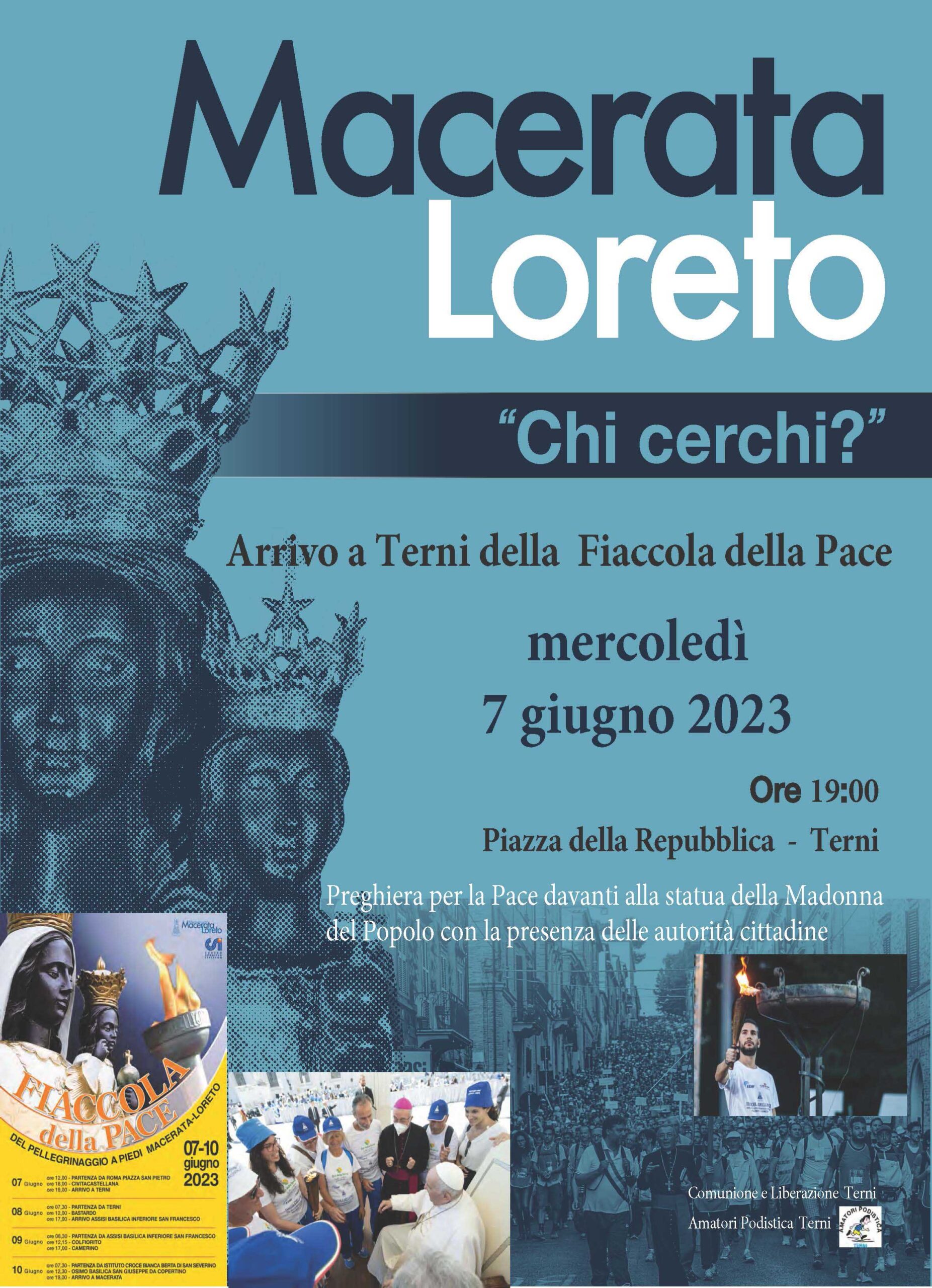 La fiaccola della Pace del pellegrinaggio a piedi Macerata – Loreto, partità da piazza San Pietro a Roma, sarà accolta a Terni mercoledì 7 giugno alle ore 19 in piazza della Repubblica, davanti all’edicola della Madonna del Popolo, dove ci sarà un momento di preghiera per la pace guidato dal vescovo Francesco Soddu. La Fiaccola, terminerà il percorso il 10 giugno a Macerata e sarà quindi portata in Pellegrinaggio durante la notte per giungere a Loreto. L’iniziativa è promossa da Comunione e Liberazione.