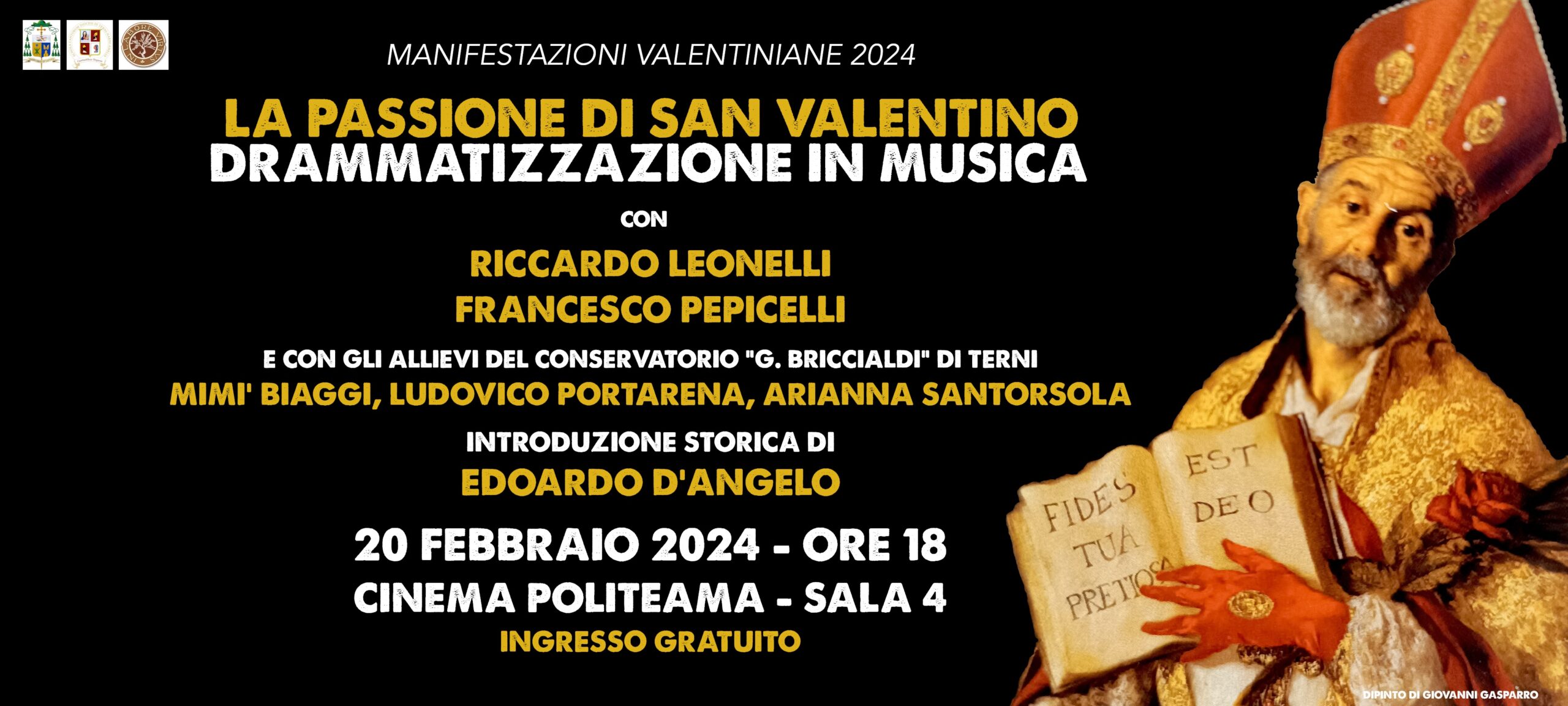 Martedì 20 febbraio alle ore 18 nella sala 4 del Cinema Politeama di Terni, è stata rappresentata la drammatizzazione in musica de “La passione di San Valentino” con Riccardo Leonelli voce recitante e Francesco Pepicelli al violoncello. La rappresentazione che unisce la storia di San Valentino alla luce dei nuovi studi effettuati dal prof. Edoardo D’Angelo, alla musica originale eseguita da alcuni allievi del conservatorio Briccialdi di Terni: Mimì Biaggi, Ludovico Portarena, Arianna Santorsola violinisti.