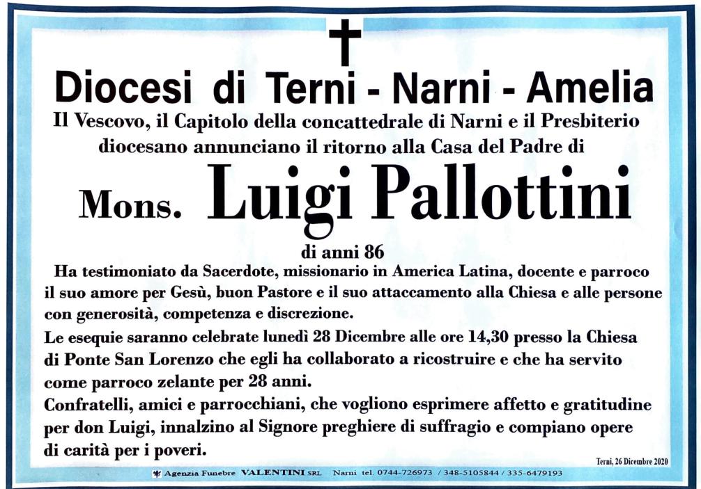 Nella mattina di sabato 26 dicembre è morto, all’età di 86 anni, mons. Luigi Pallottini, sacerdote diocesano, cappellano di Sua Santità, canonico emerito del capitolo della concattedrale di Narni. Un sacerdote mite e umile, sempre presente con la sua amabilità e bonarietà tra le persone della comunità che gli era stata affidata, che ne ha apprezzato le doti umane e spirituali. La missione evangelizzatrice è stata sempre al centro del suo ministero che ha svolto a Configni, Calvi e Narni, ma anche in terre lontane, in Cile, dove è stato missionario per diversi anni, mostrando umanità e solidarietà verso i più deboli e bisognosi, alle famiglie e ai giovani. Laureato in lingue straniere, si è dedicato all’insegnamento dello spagnolo negli istituti superiori di Terni ed è stato anche archivista del capitolo di Narni.