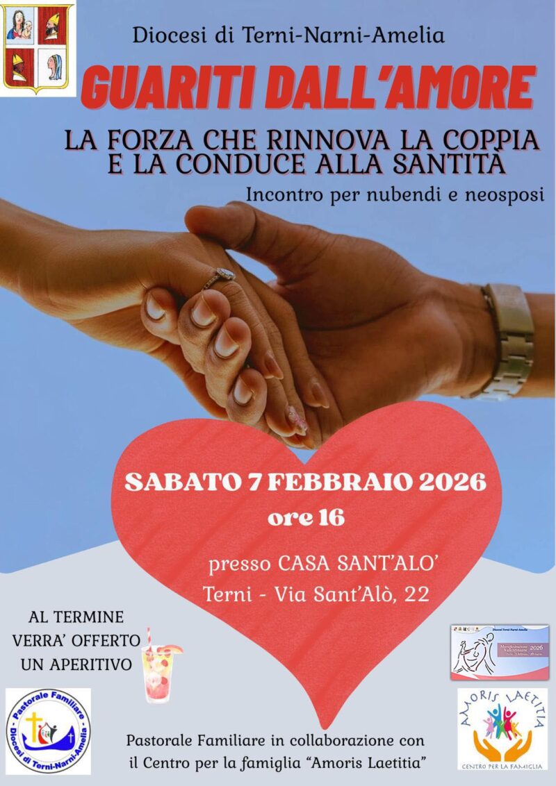Nell’ambito degli eventi valentiniani 2026, sabato 7 febbraio alle ore 16.00 presso Casa Sant’Alò, la Pastorale Familiare diocesana, in collaborazione con il Centro Amoris Laetitia, ha organizzato un incontro per nubendi e neosposi dal titolo “Guariti dall’amore. La forza che rinnova la coppia e la conduce alla santità”. Sarà un incontro esperienziale su alcune dinamiche di confronto e crescita di coppia.