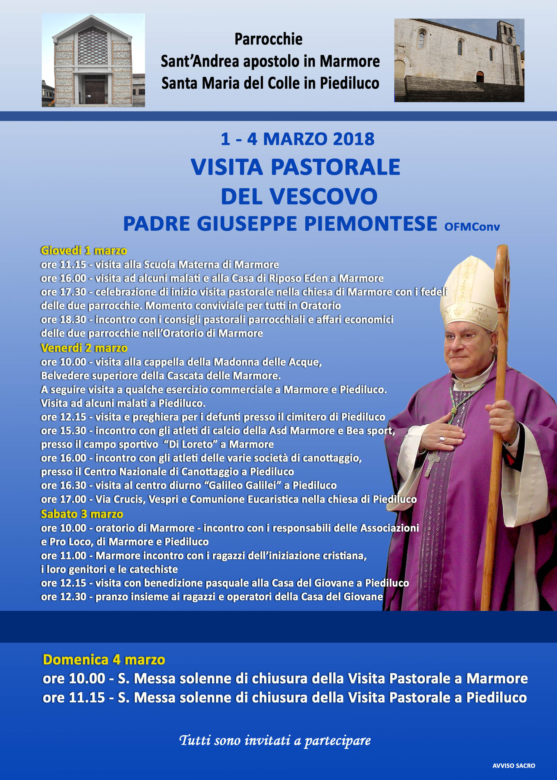 Domenica 4 marzo ore 10.00 – S. Messa solenne di chiusura della Visita Pastorale a Marmore ore 11.15 – S. Messa solenne di chiusura della Visita Pastorale a Piediluco