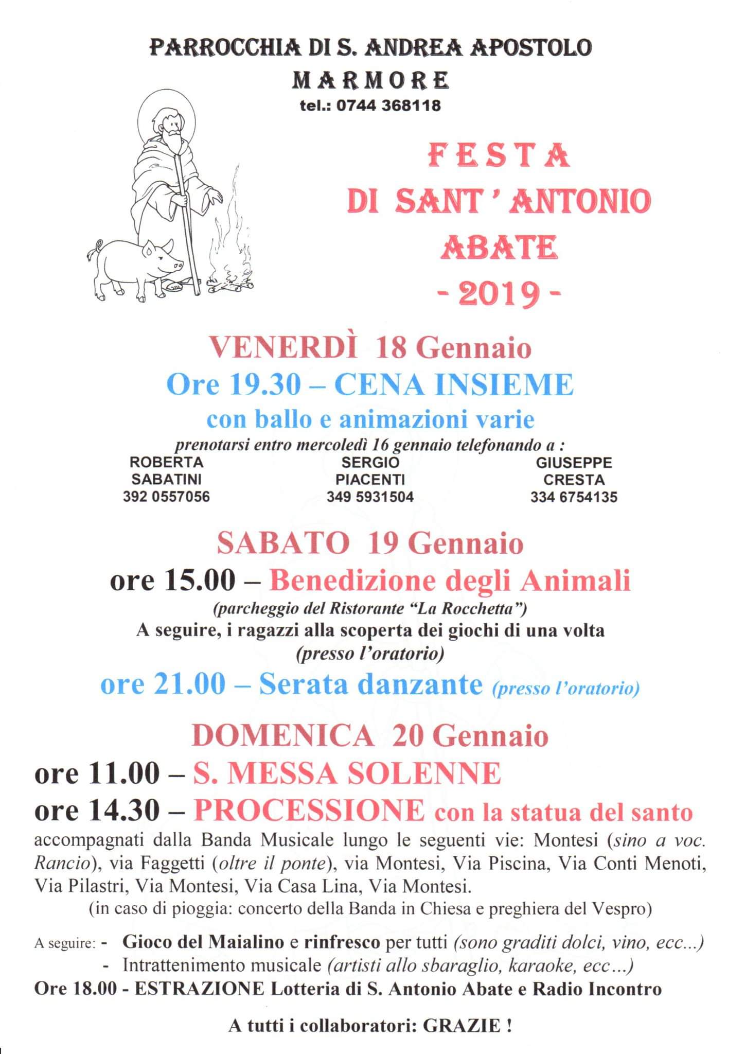 Domenica 20 gennaio alle ore 11 santa messa solenne e alle ore 14.30 processione con la statua del santo. Venerdì 18 gennaio alle ore 19.30 cena in oratorio. Sabato 19 gennaio alle ore 15 benedizione degli animali e per i ragazzi giochi di una volta.