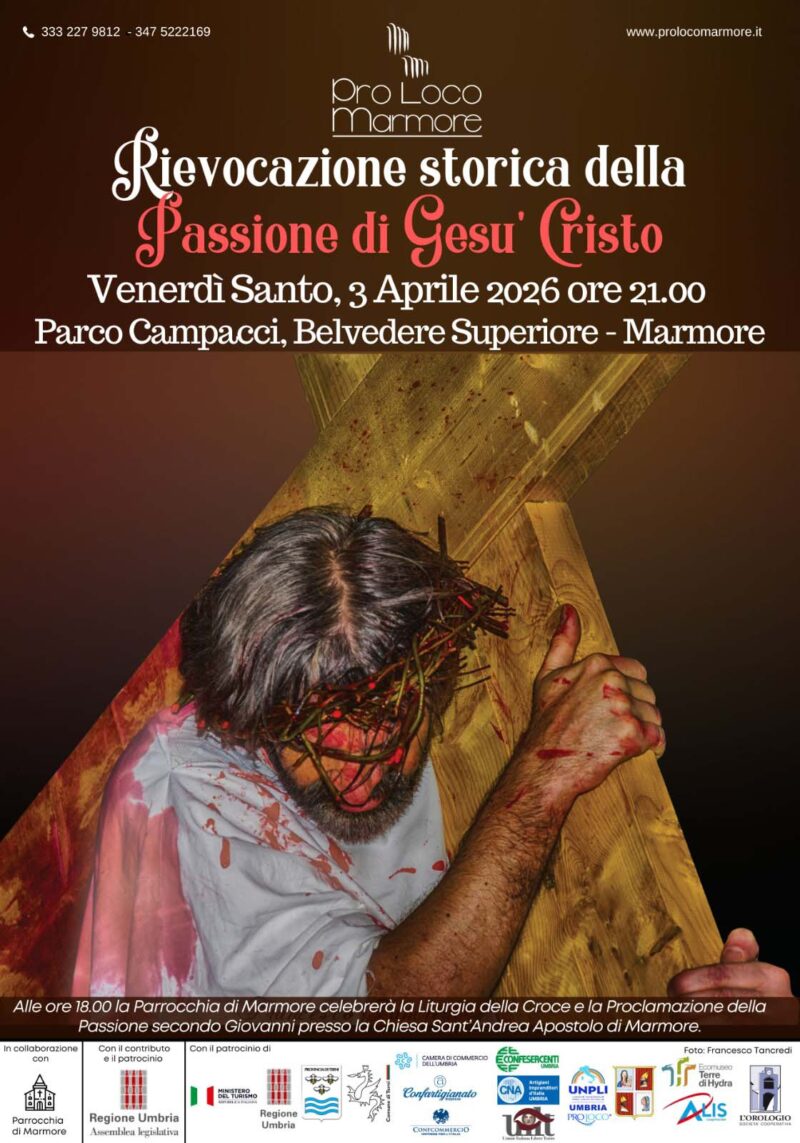 Venerdì santo 3 Aprile 2026 ore 18 Liturgia della Croce e Proclamazione della Passione secondo Giovanni presso la Chiesa di Sant’Andrea Apostolo, Marmore. Alle ore 21 la rievocazione della Passione di Cristo itinerante ai Campacci di Marmore.
