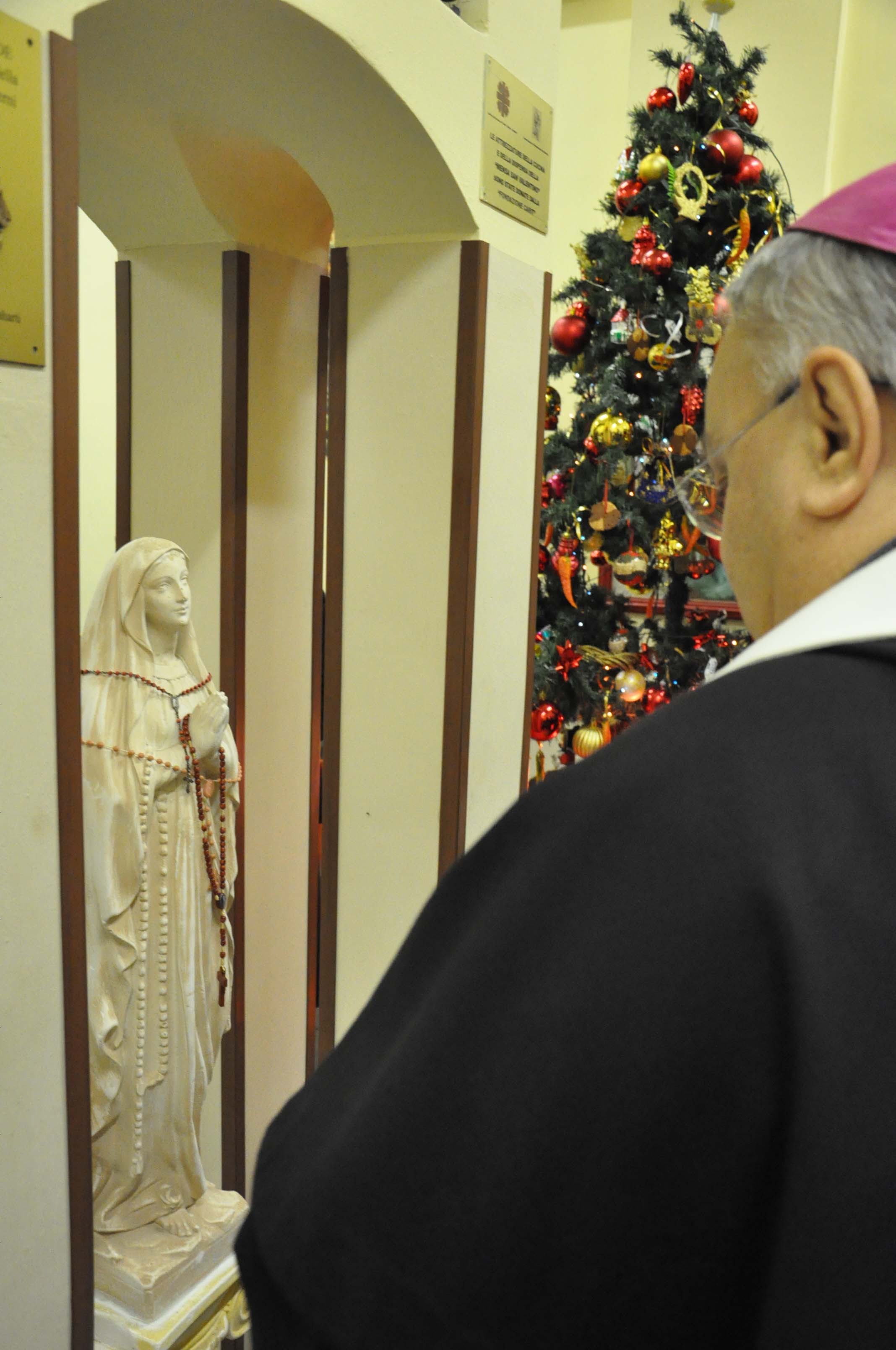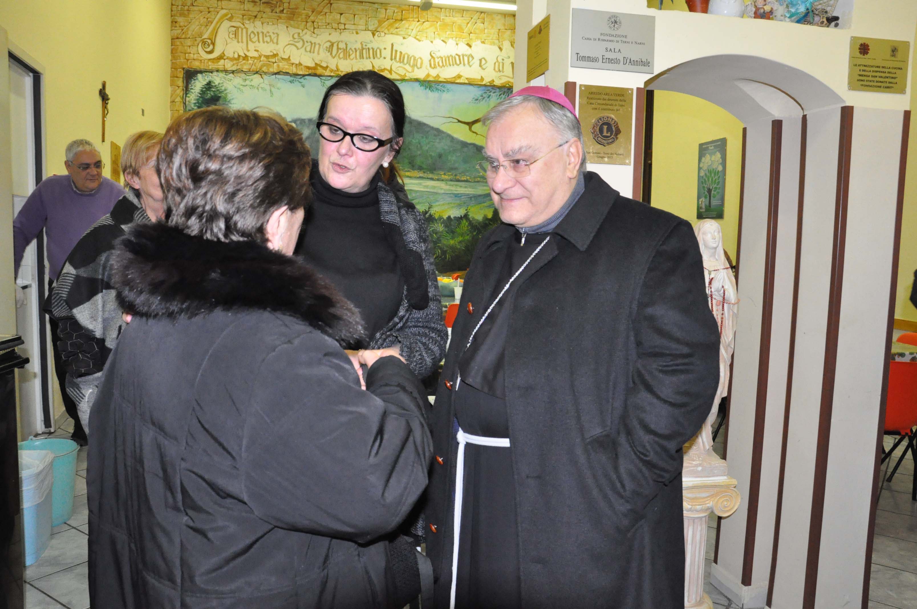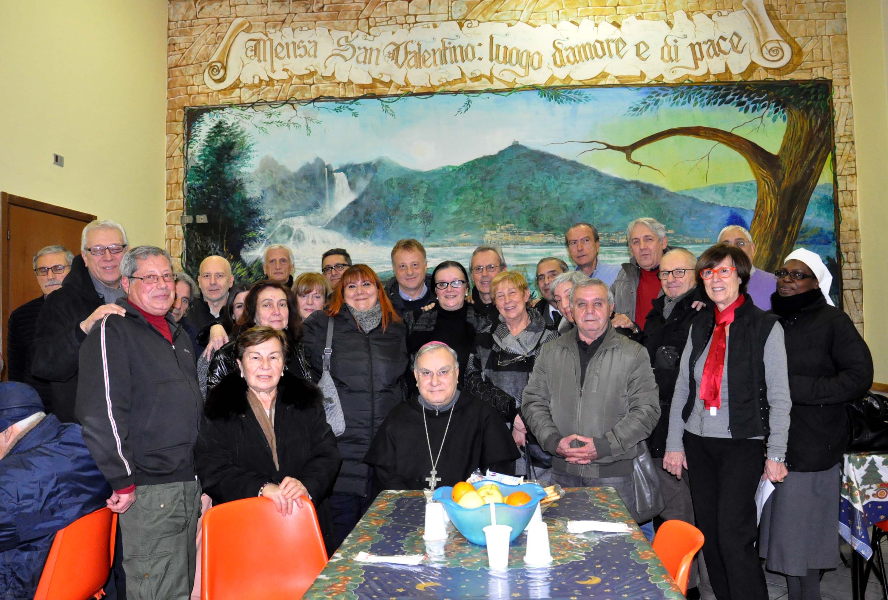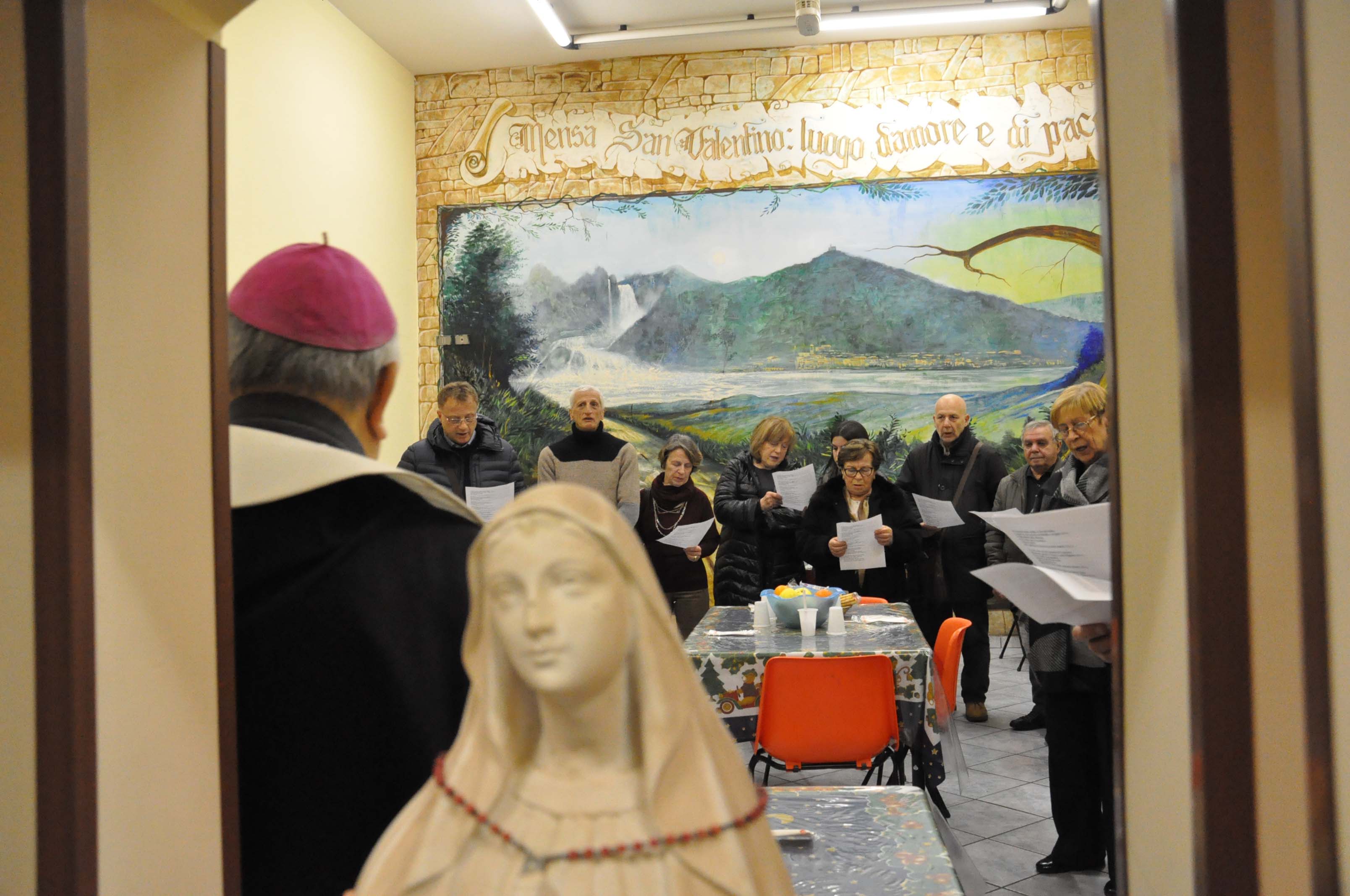 A pochi giorni dal Natale, il vescovo Giuseppe Piemontese ha fatto visita alla mensa “San Valentino” nella sede della Caritas diocesana, per uno scambio augurale con i volontari e ospiti della mensa. Un’occasione anche per ringraziare quanti a vario titolo collaborano e sostengono la continuità dell’opera a servizio dei più bisognosi. Il vescovo ha benedetto la nuova  statua della Madonna posta all’ingresso della mensa: “coloro che davanti ad essa pregheranno per mezzo dell’invocazione del Signore ottengano la salute dell’anima e del corpo”. E’ stato anche ricordato Paolo Vedova storico volontario alla mensa San Valentino recentemente scomparso al quale è stato dedicato un quadro a suo ricordo con i nomi di tutti coloro che hanno prestato servizio con lui alla mensa e degli ospiti.