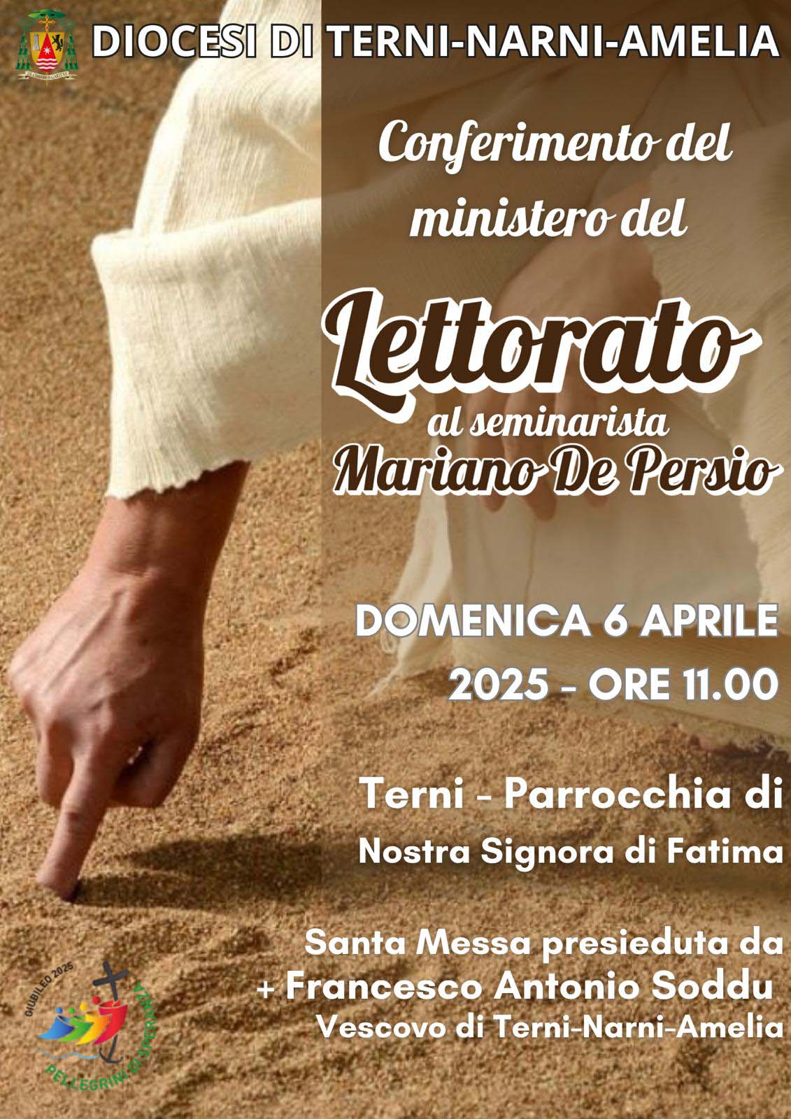 Domenica 6 aprile nella celebrazione presieduta dal vescovo Francesco Soddu della quinta domenica di Quaresima, è stato conferito il ministero del lettorato al seminarista Mariano De Persio. La messa è stata concelebrata da don Matteo Antonelli parroco di Gabelletta.