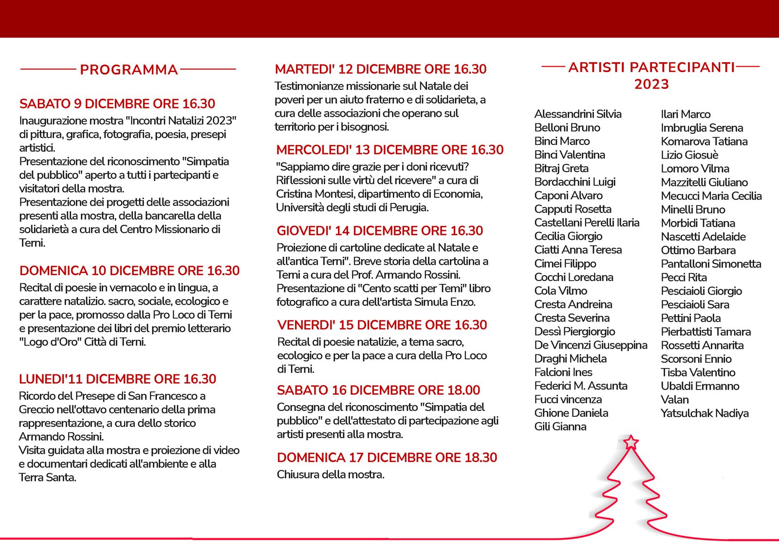 Tra gli eventi culturali proposti l’10 e il 15 dicembre si terrà il Recital di poesie in vernacolo e in lingua, a carattere natalizio, sacro, sociale, ecologico e per la pace, promosso dalla Pro Loco di Terni e presentazione dei libri del premio letterario “Logo d’Oro” Città di Terni.