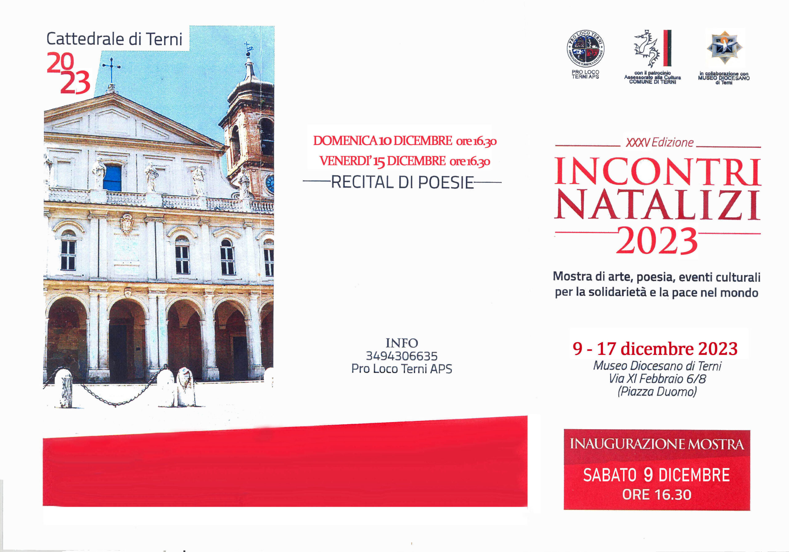 In preparazione al Natale, il Museo diocesano e la Proloco, con il patrocinio dell’assessorato alla cultura del Comune di Terni, promuovono dal 9 al 17 dicembre presso il Museo diocesano di Terni, la rassegna d’arte “Incontri natalizi 2023”, collettiva di pittura, scultura, grafica, fotografia, presepi artistici e africani, cartoline natalizie, poesia, la bancarella della solidarietà e eventi culturali dedicati alla solidarietà e pace nel mondo.