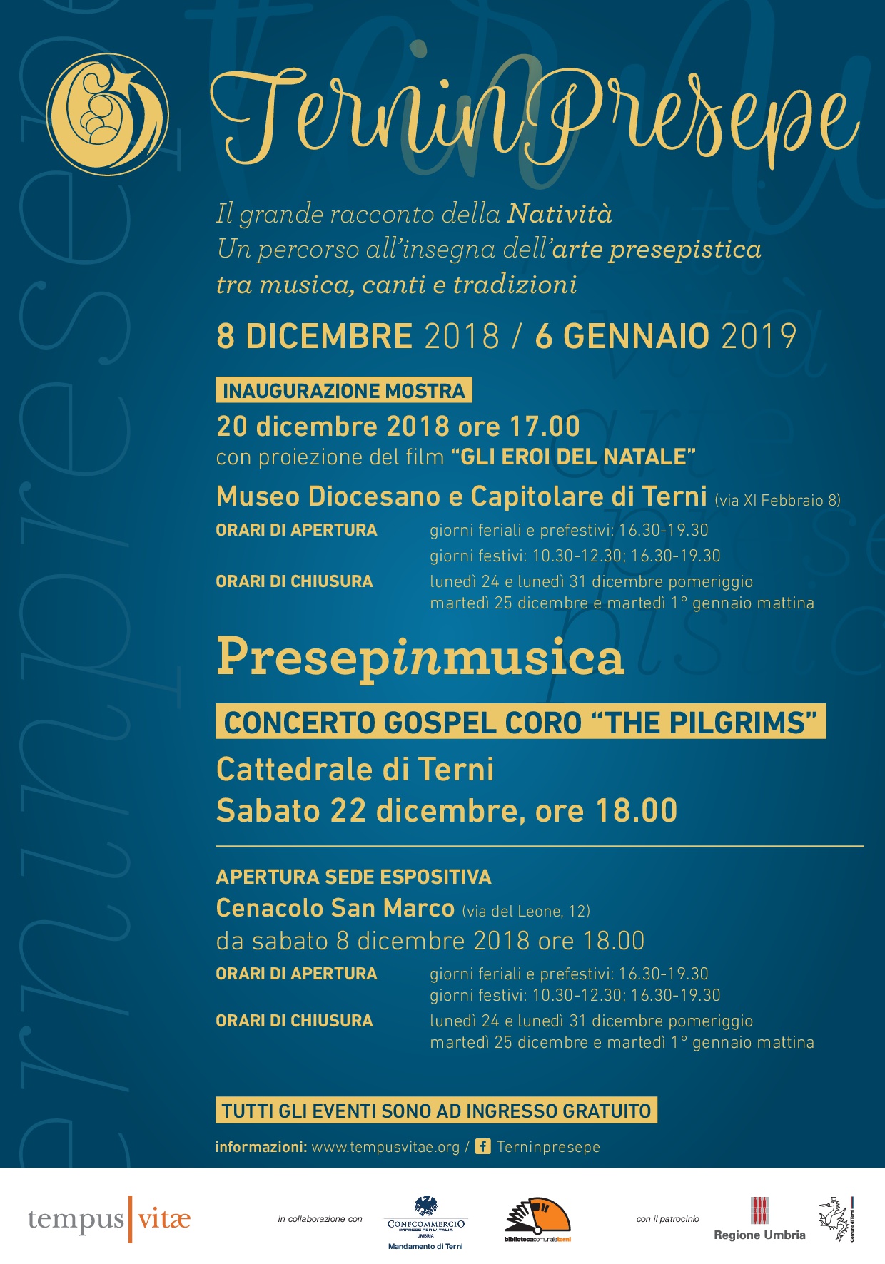 Inoltre per questo fine settimana nell’ambito di “PresepinMusica” sabato 22 dicembre alle ore 18,00 presso la Cattedrale di Terni si terrà il concerto Gospel del coro “THE PILGRIMS”. Nella zona del centro il 21 dicembre a cura degli allievi dell’Istituto Briccialdi di Terni dalle ore 17,00 concerto itinerante.