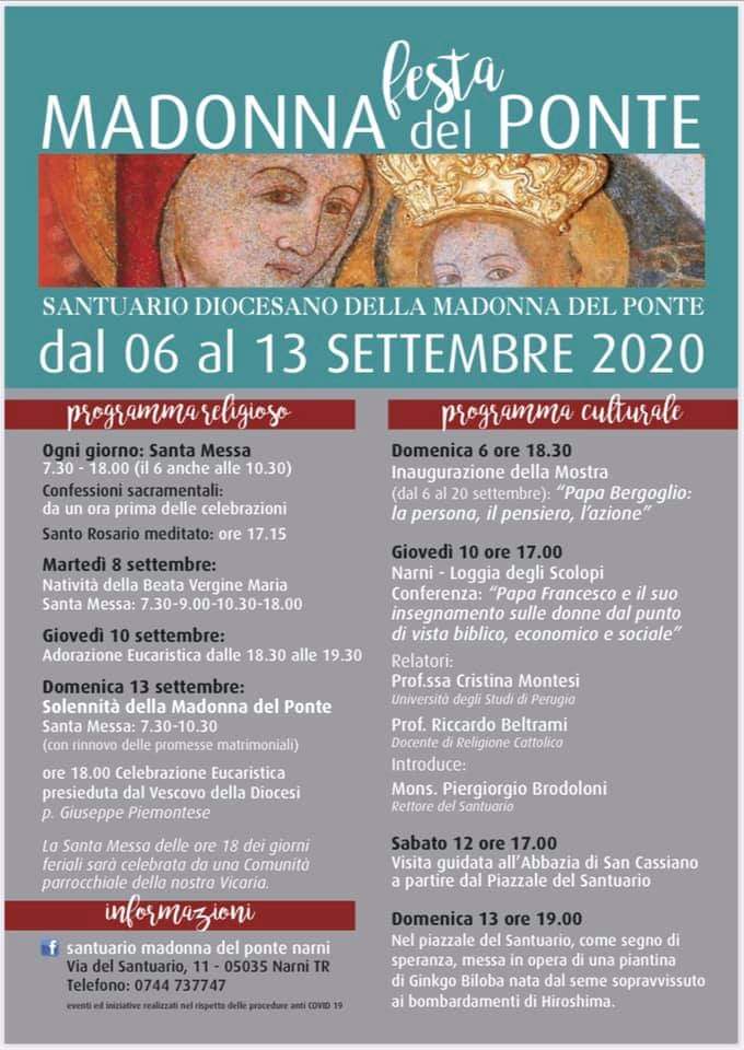 Nei giorni della festa, dal 6 al 13 settembre 2020, ci sarà la messa alle ore 7.30 e alle 18 e il rosario meditato. Domenica 6 settembre, alle ore 18.30, inaugurazione della mostra “Papa Bergoglio: la persona, il pensiero, l’azione”.