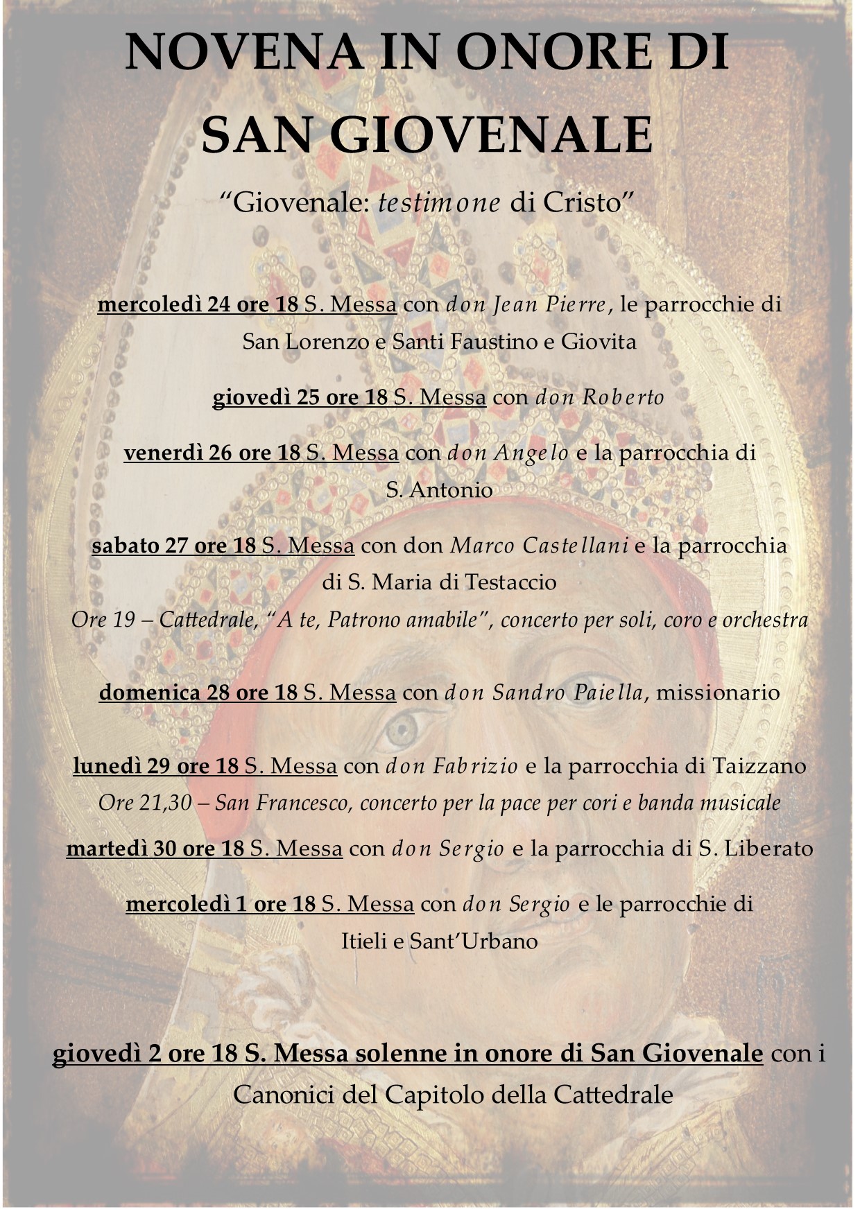 San Giovenale primo vescovo di Narni vissuto nel IV secolo, originario dell’Africa del nord, giovane medico, giunge a Roma, forse per sfuggire alle persecuzioni o per perfezionare gli studi. Per la sua pietà il papa San Damaso I lo ordinò vescovo di Narni nel 368. Giovenale svolse con amore e fedeltà il ministero, affidatogli da Gesù alla guida della comunità. Si pose ad evangelizzare, organizzando la vita civile e soprattutto ecclesiale.