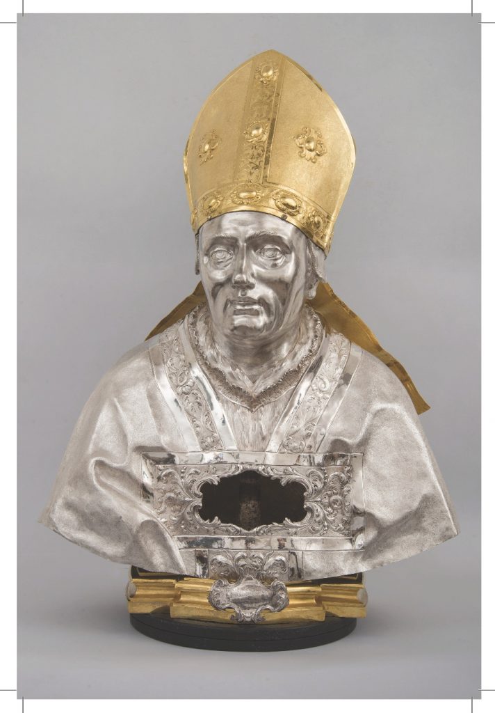 Il prezioso busto reliquiario di San Giovenale ritrae il santo in abiti vescovili, casula e mitra, su una sobria base modanata in bronzo dorato. per il resto il manufatto è realizzato in lamina d’argento e di rame dorato, lavorato a sbalzo e a cesello, mentre il volto è condotto a fusione. l’iscrizione, incisa a bulino sulla targa, configura simbolicamente quest’oggetto devozionale come un ex voto, offerto da tutta la città, Narnia universa, e con il contributo di tutti i devoti dopo lo scampato pericolo del terremoto del 1703. Sulla paternità dell’opera la critica non si è mai espressa, pur riconoscendone la squisita fattura, ma ora grazie al recente restauro è stato possibile svelare l’identità del maestro argentiere, riportando alla luce il marchio impresso sul prezioso metallo, la lupa di Siena. Si tratta di Urbano Bartalesi, (1641-1732) l’esponente più noto della famiglia di argentieri di origine senese, attiva a Roma tra il 1634 e il 1793. Il maestro, stipendiato da Alessandro VIII, eseguì per Innocenzo XII sei bacili in argento dorato, quattro conchiglie d’argento per l’altare della cappella di sant’Iignazio nella chiesa del Gesù, gli ornamenti per l’urna di san Filippo Neri a S. Maria in Vallicella e un’acquasantiera in bronzo dorato e argento per la regina Maria Teresa d’Austria. Oltre al bollo del Bartalesi è riconoscibile anche quello di Carlo Modesti, apposto a garanzia della qualità dell’argento. Un’opera così rara e importante, commissionata a Roma e destinata alla cattedrale di Narni agli inizi del Settecento, non può non far sospettare che il tramite tra i narnesi e uno degli argentieri più celebri dell’epoca, possa essere stato il cardinal Giuseppe Sacripante, munifico mecenate nei riguardi della sua città natale.