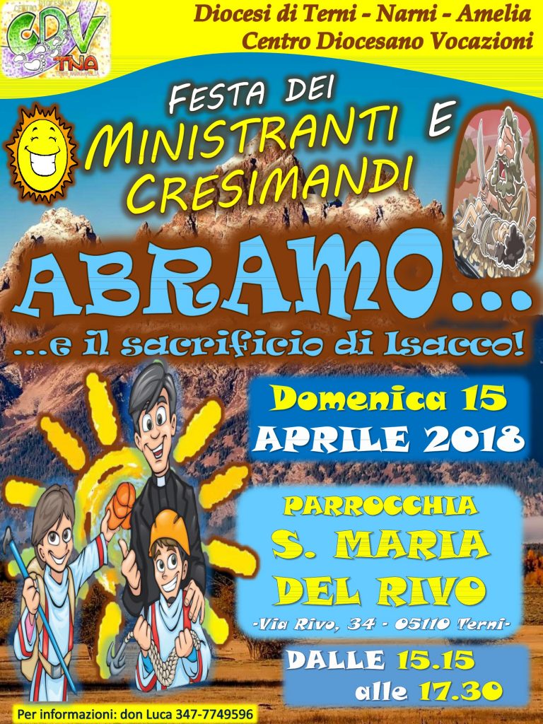 Domenica 15 aprile dalle 15.15 alle 17.30 nella parrocchia di Santa Maria del Rivo a Terni si terrà l’incontro diocesano dei ministranti e cresimandi dedicato al tema: “Abramo…e il sacrificio di Isacco” promossa dal centro diocesano Vocazioni, al quale prenderà parte il vescovo Giuseppe Piemontese.