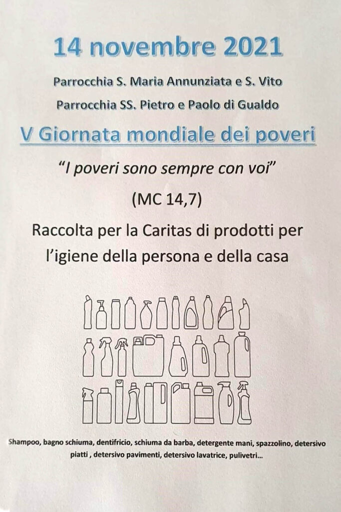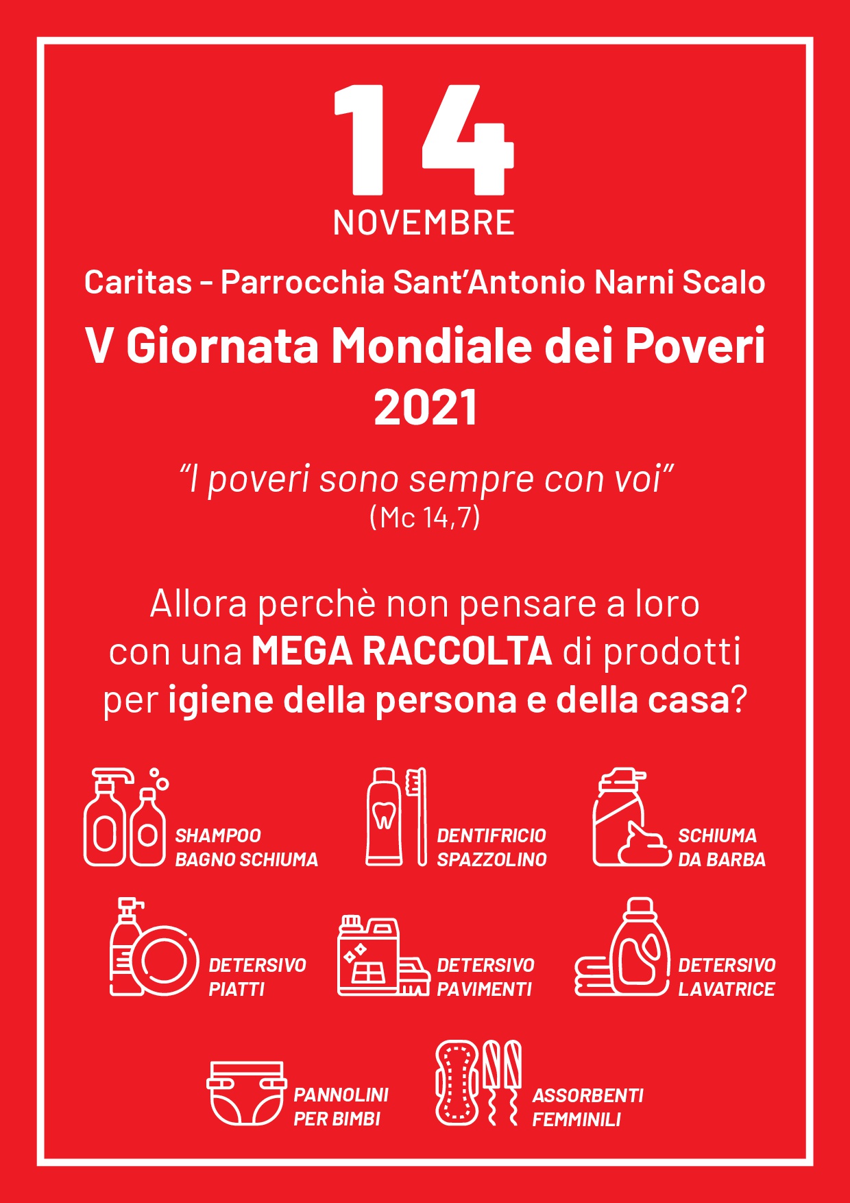 In occasione della giornata dei poveri il 14 novembre, la Caritas parrocchiale di Sant’Antonio di Padova a Narni scalo e la parrocchia di San Vito e Gualdo promuovono una raccolta di prodotti per l’igiene personale e della casa
