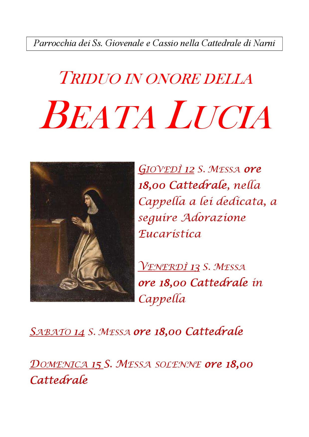 Giovedì 12 novembre ore 18 santa messa nella cappella della beata Lucia nella cattedrale di Narni. A seguire adorazione eucaristica.