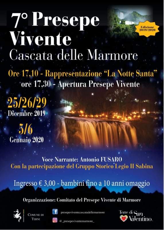 Alla Cascata delle Marmore sono circa 100 figuranti a dare vita al presepe vivente tra le acque, nell’incantevole cornice del parco della Cascata, in un allestimento ampliato e reso ancora più suggestivo. Le rappresentazioni sono in programma il 25, 26 e 29 dicembre e il 5 e 6 gennaio 2020 dalle 17 alle 19.