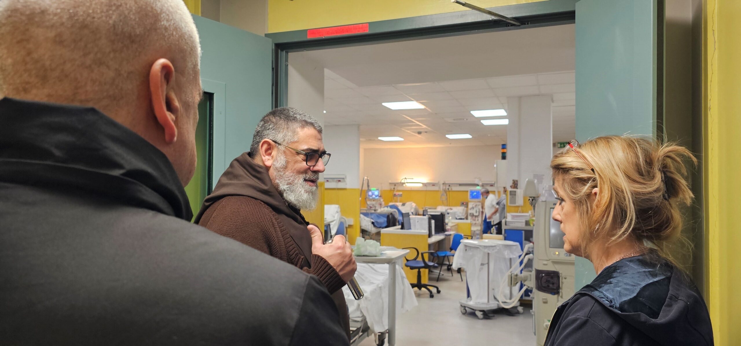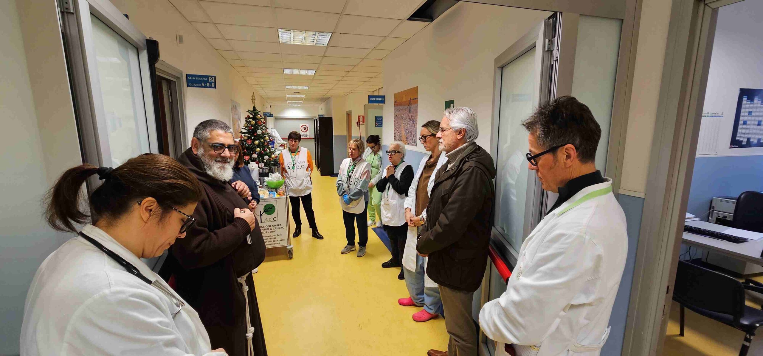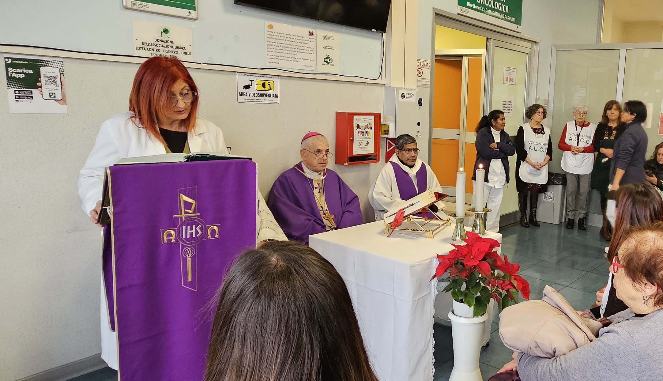 In occasione del Natale, il 16 dicembre, il vescovo Francesco Antonio Soddu ha fatto visita ai malati e operatori sanitari dell’ospedale Santa Maria di Terni. La mattinata è cominciata con l’incontro con il direttore Andrea Casciari, l’amministrazione e risorse umane, i tecnici dell’azienda ospedaliera per uno scambio augurale e una benedizione. Quindi è proseguita con la visita all’interno del nosocomio, dove il vescovo Soddu, accompagnato dal cappellano padre Angelo Gatto, dal secondo cappellano padre Ghonzalo, dai collaboratori della cappellania e dalle suore Missionarie Identes, ha visitato il laboratorio analisi, la struttura di Pneumologia, Oncoematologia, Nefrologia e dialisi, la struttura di Oncologia medica e day hospital oncologico dove ha celebrato la messa nell’atrio del padiglione.