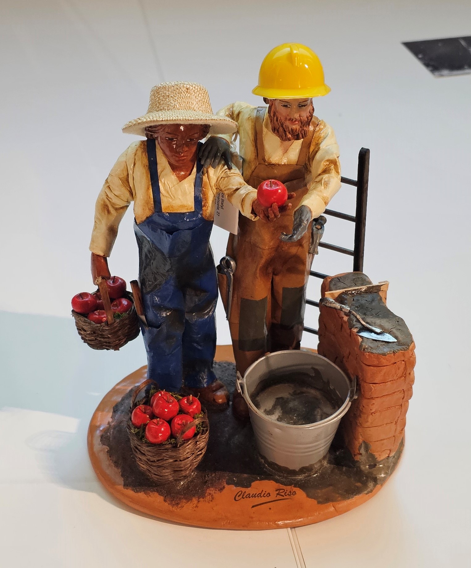 Anche quest’anno la statuina è realizzata in cartapesta dal Maestro presepista Claudio Riso e raffigura il lavoro nei settori dell’agricoltura e delle costruzioni, con l’obiettivo di far emergere i temi dell’integrazione e dell’inclusione anche attraverso la cultura della sicurezza sul lavoro, per aggiungere al presepe figure che parlino del presente ma anche del futuro.