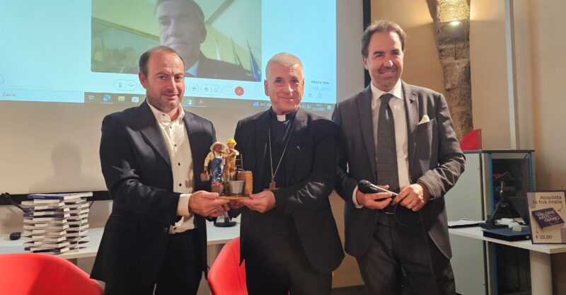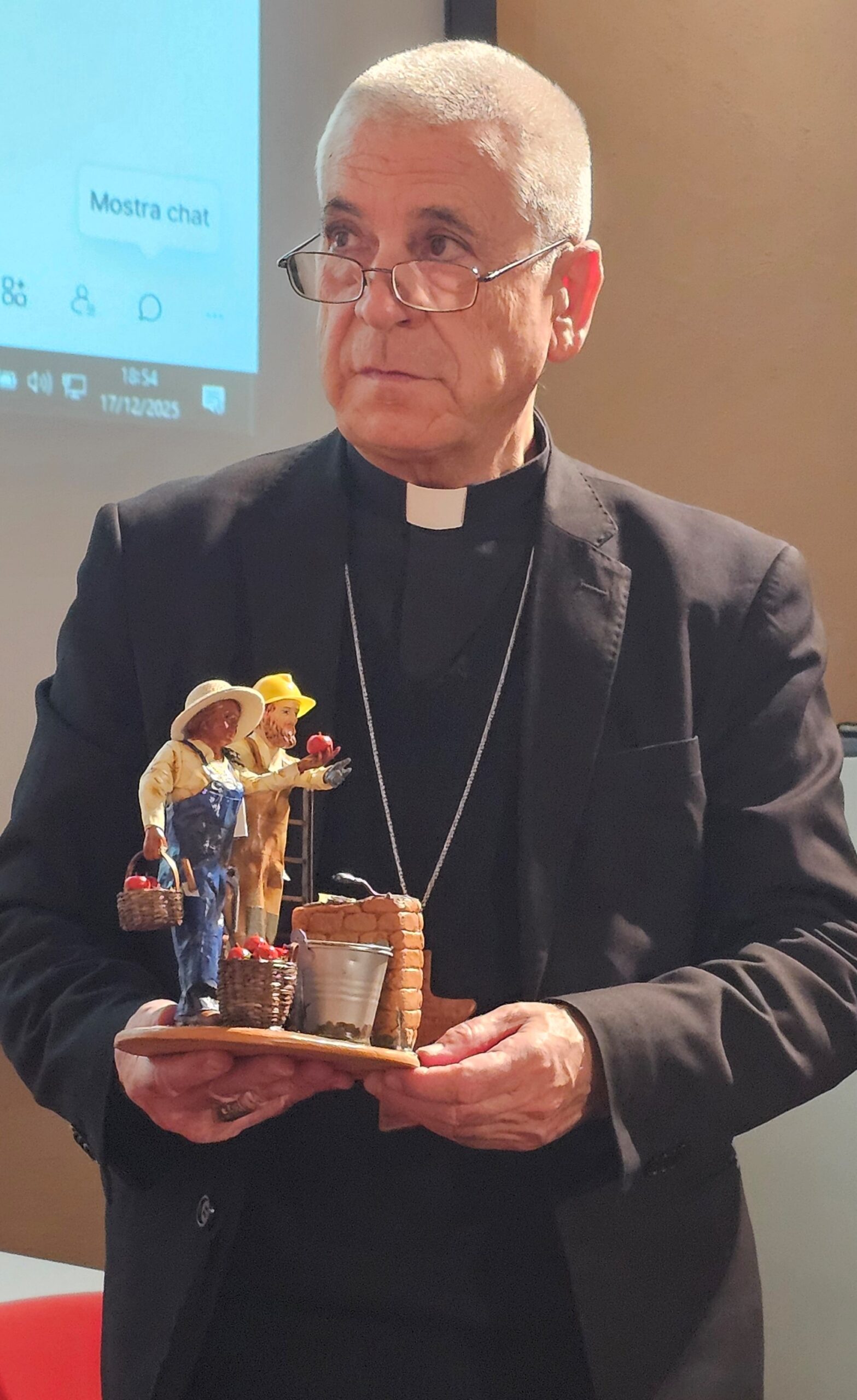 Si rinnova la tradizione della Confartigianato della donazione annuale di una statuina del presepe al vescovo Soddu avvenuta in occasione della presentazione del terzo volume “Storie di Valore Artigiano”. A consegnare l’opera che raffigura un lavoratore agricolo e un edile, il presidente di Confartigianato Imprese Terni Mauro Franceschini e il vice presidente di Coldiretti Umbria Manni Massimo.