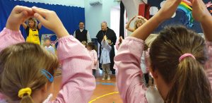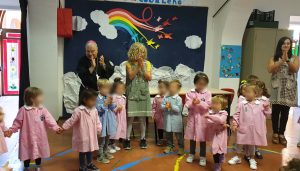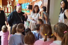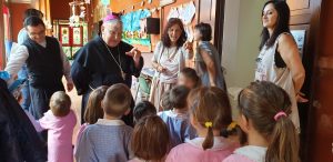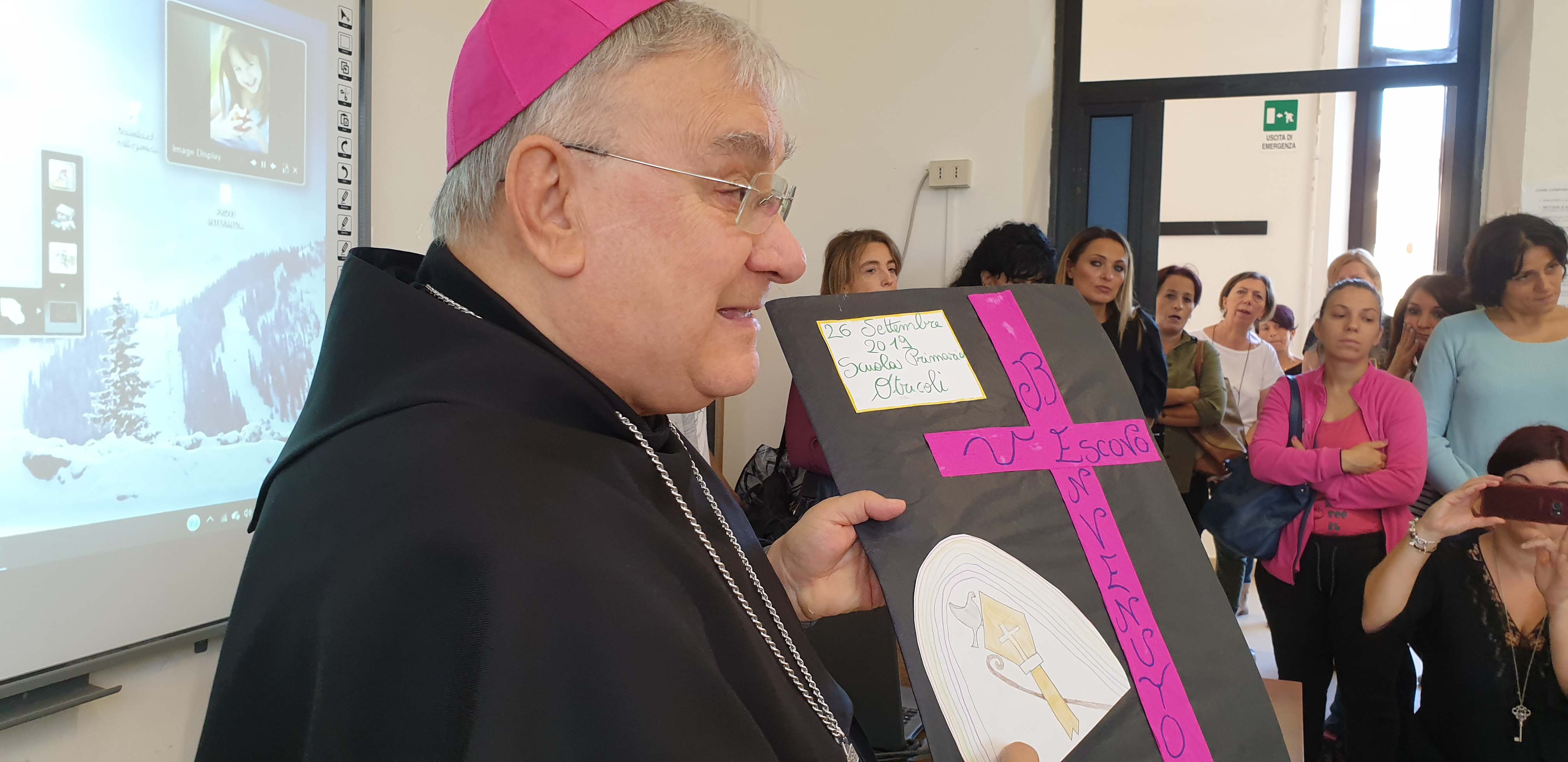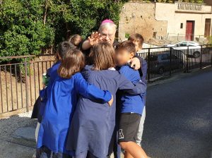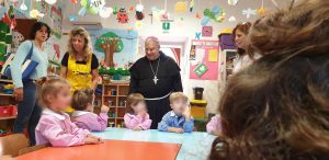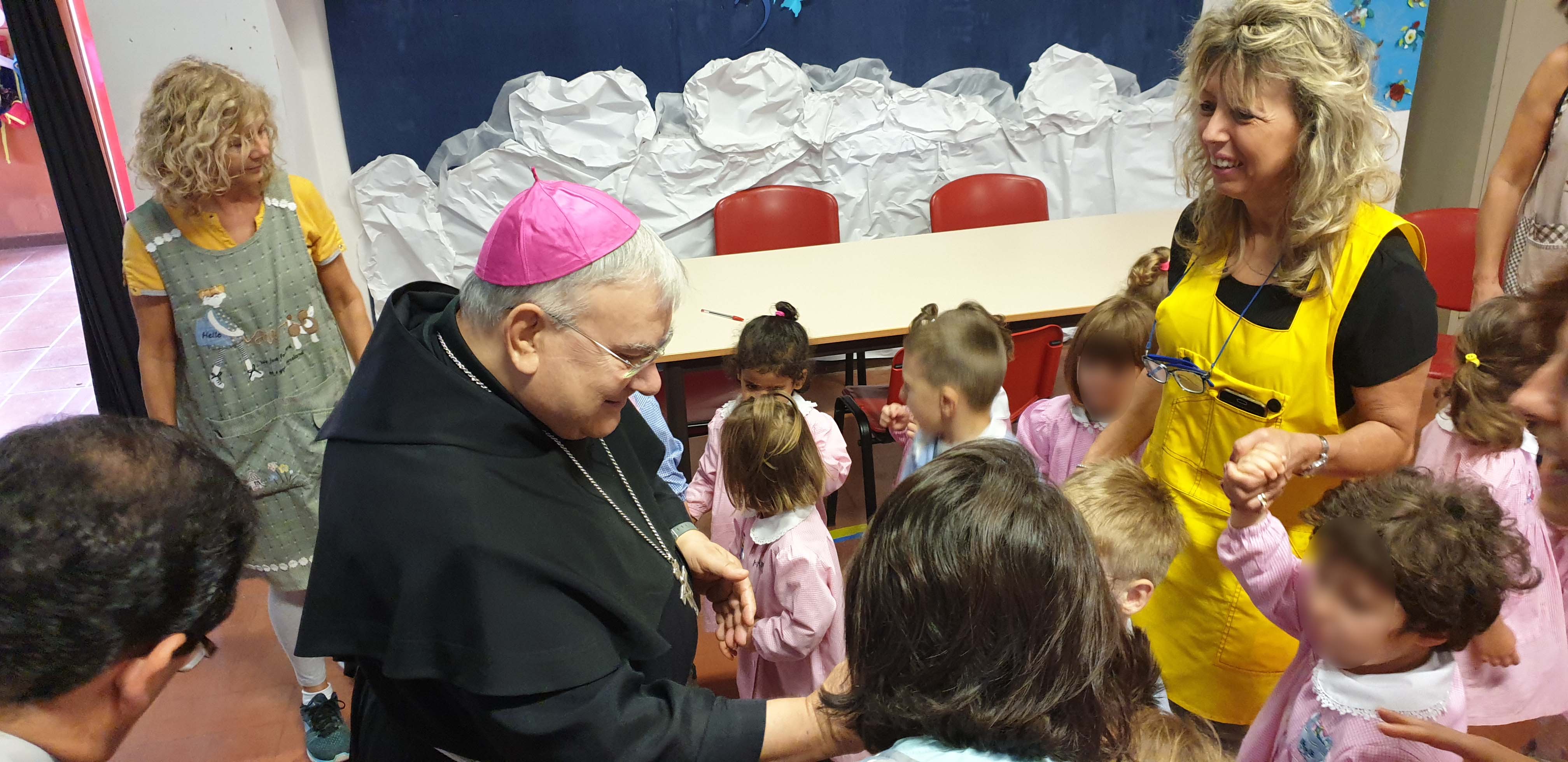Un incontro gioioso e festante è stato quello con i bambini della scuola dell’infanzia che hanno accolto il vescovo con dei canti e un girotondo.