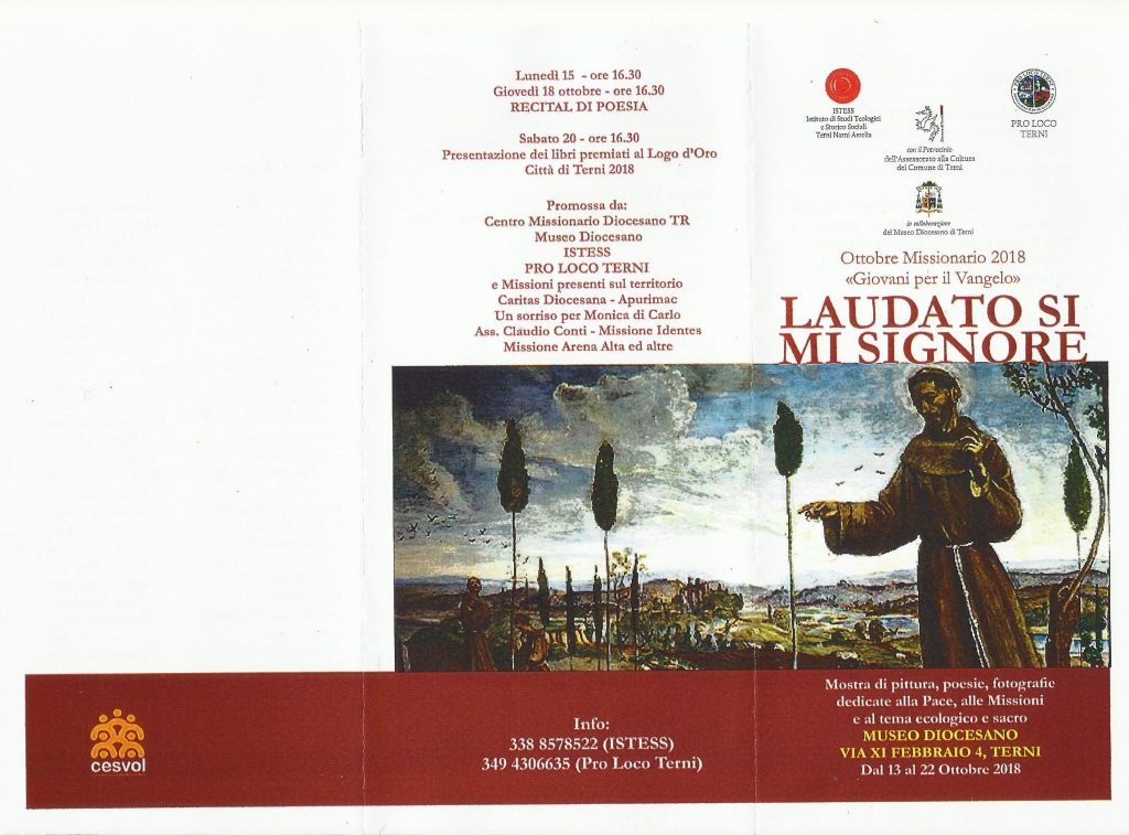 In occasione del mese missionario, dal 13 al 22 ottobre presso le sale espositive del Museo diocesano di Terni è allestita la mostra “Laudato si’ mi’ Signore” di pittura, poesia, fotografie dedicate alle missioni e alla pace. Un‘occasione per aprire una riflessione e conoscenza della ricchezza di esperienze missionarie portate avanti in questo tempo, attraverso la mostra missionaria promossa dal Centro missionario diocesano con il contributo delle tante associazioni che operano in terre di missione, con film e video a testimonianza di coloro che hanno vissuto l’esperienza missionaria ad gentes in varie parti del mondo.