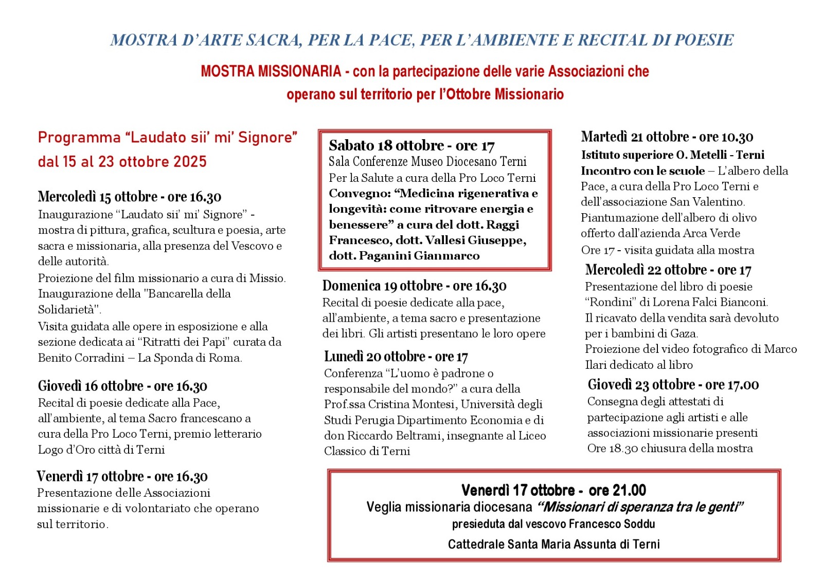 Dal 15 al 23 ottobre ci sarà anche la mostra missionaria “Laudato si’ mi’ Signore”, mostra fotografica e documentaria missionaria, di pittura, grafica, scultura presso le sale espositive del Museo diocesano di Terni. La mostra, dedicata alle missioni, alla pace, al tema sacro ed ecologico, è promossa dal Centro Missionario della diocesi, dalla Pro Loco Terni, con il contributo del Museo diocesano di Terni, della San Vincenzo de’ Paoli, associazione Claudio Conti, missione Arena Alta, missione in Costa Rica, comunità Casa del Giovane Piediluco, missionari nella diocesi di Kananga Congo.